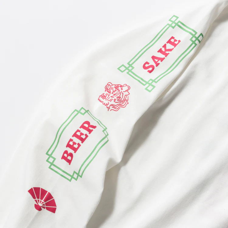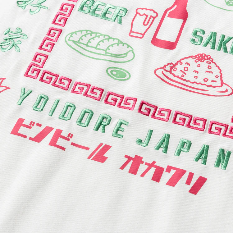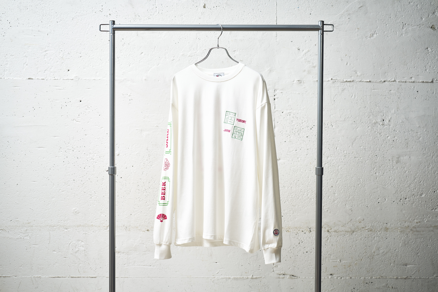 ネオン瞬く町中華の暖簾をくぐる瞬間、こんなロンTが相棒ならテンションはもっと上がるはず。ヨイドレの別注ロンTは、前後左右すべてに町中華と酒への愛を込めたグラフィックを散りばめた主役級の一枚。プリントと刺繍を贅沢に重ねた立体感は、着るだけで軽妙な遊び心たっぷりの着こなしを約束。ロンTらしい軽やかな着心地で、乾杯前から気分は爆上がり!