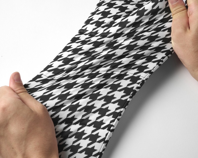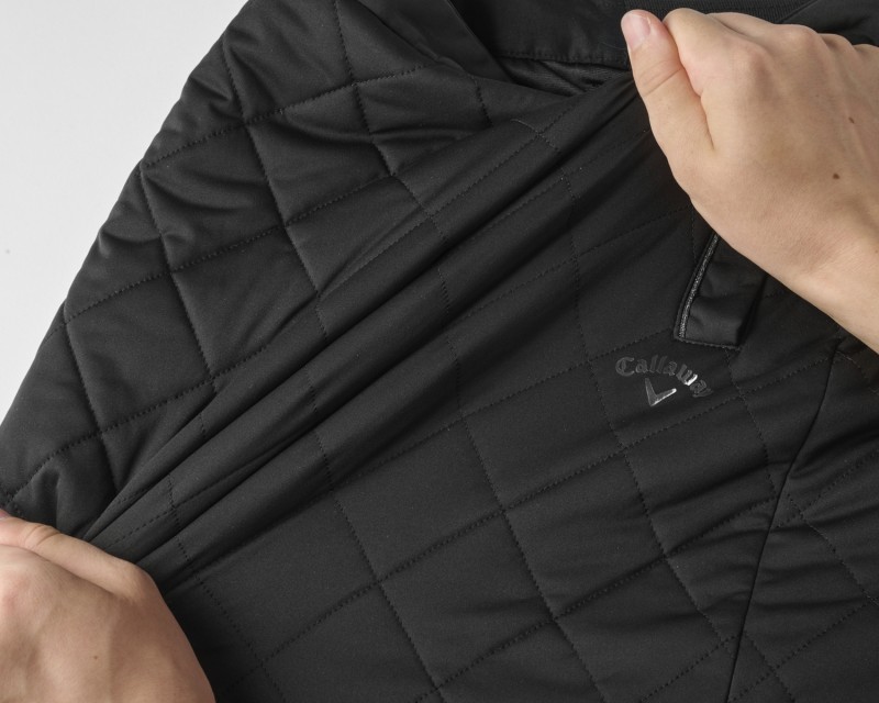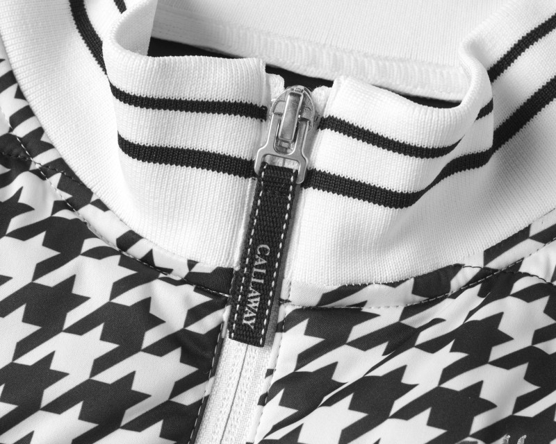 嵩高な中綿を包み込むのは、「スターストレッチ」というキャロウェイオリジナルのストレッチ素材。ご覧のようにしっかり伸びてスイングをジャマすることなく、リブが高く設計されたネックが風をシャットアウトしてくれるから、“待ち”が長くてもぬくぬくでコースを回れるんですね。全面にプリントされた千鳥格子もキュートで、羽織っているだけでお洒落感二割増しというわけ♪