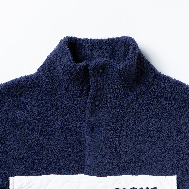 パタ○ニアを彷彿させる(!?)レトロアウトドアなテイストのプルオーバージャケットのデザインとなっています。胸元には大きなポケット付きで、フラップに用いたキルティング素材の別布もポイント♪ 裾にはドローコードで仕込んでおり、キュッと絞ってシルエットの変化も楽しめます。自宅だけでなく、コンビニやスーパーなどのワンマイルウェアとしても活躍間違いなし! パートナーや家族とのシェア使いにもぴったりです。
