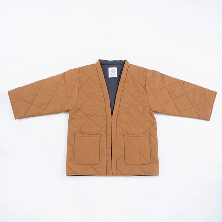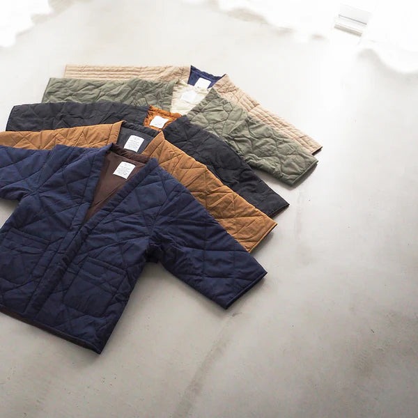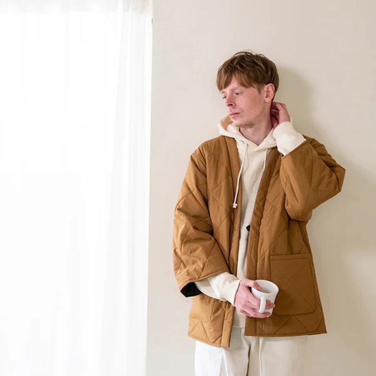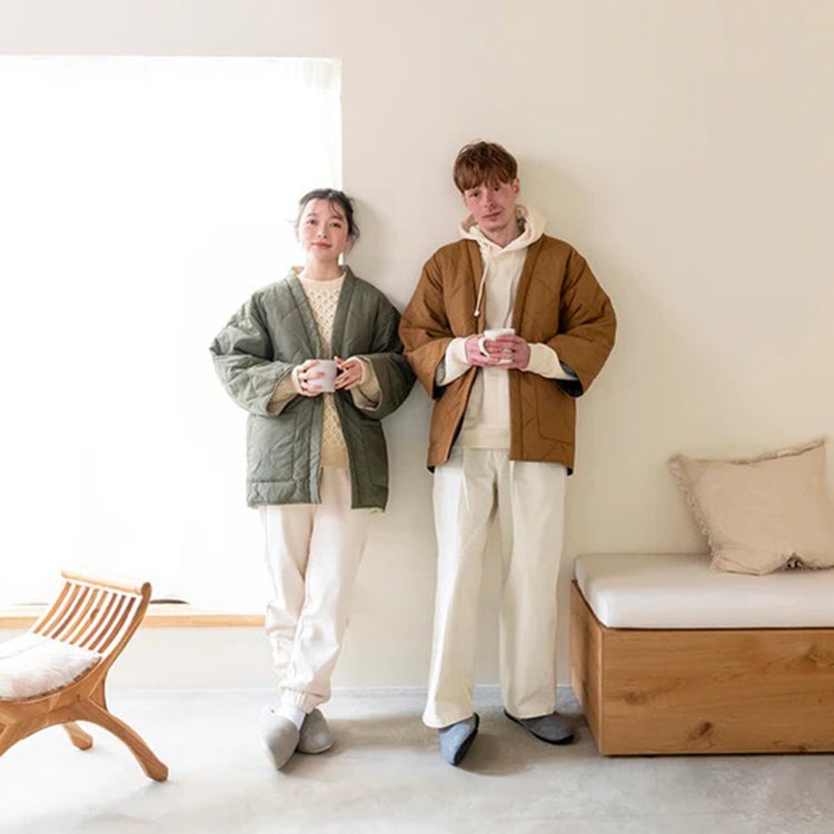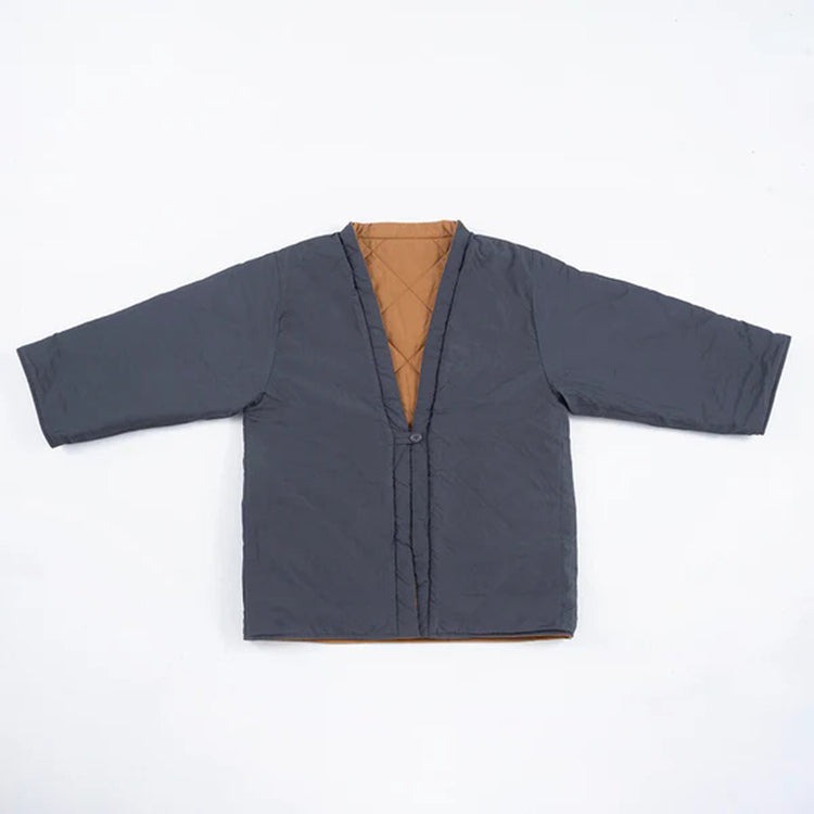 和の雰囲気を残しつつ、現代の空気を取り入れたモダンな佇まいが魅力。適度なボリューム感のある中わたが、程よい暖かさをキープしてくれます。アウターの上に羽織ったり、Tシャツの上に羽織ったりと幅広い着用に対応。使いやすいカラーのリバーシブル仕様なので2着分の活躍を期待できます。