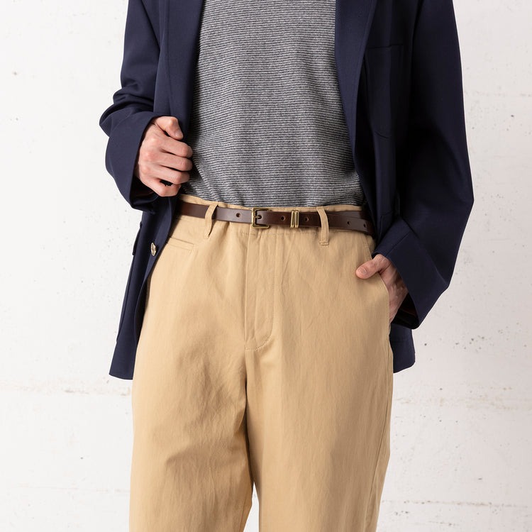 スタイリングがなんとなく締まらない……。そんな日は、ベルトにひと工夫加えるとグッと見栄えが引き締まります。バーンズ アウトフィッターズの「Narrow HMG Lthr Bt」は、姫路レザーの一枚革に真鍮バックルを合わせた一本。レザーの質感と随所の真鍮使いが高級感を演出して、着こなしをワンランク上に引き上げてくれます。また、細幅となっているのも、近年のベルトのトレンドでお洒落見えするポイント。デニムからチノ、スラックスまで守備範囲が広く、主張は控えめでも要所はきっちり。今どきのウエストもコーデも引き締める、頼れる名バイプレーヤーです。