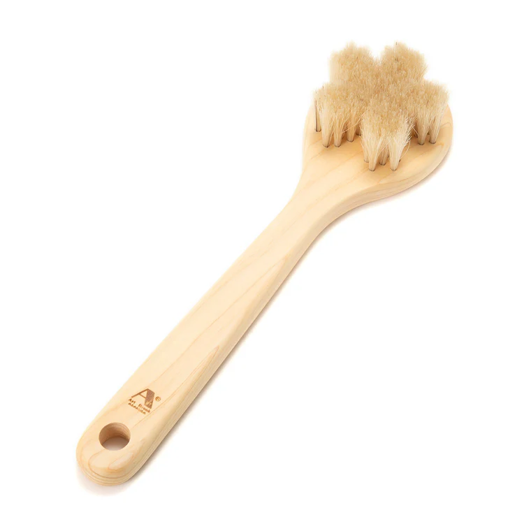 天然白馬毛の束と束の間に空気をたっぷり抱え込む構造で、わずかな石けんでももっちりとした泡立ちに。毛足は3cmと長く、肌触り良好。さくらの花びらのように広がるヘッドが肩や腰の凹凸に寄り添い、ボディラインにしっかりフィットし、体をすっきりと洗い上げてくれます。