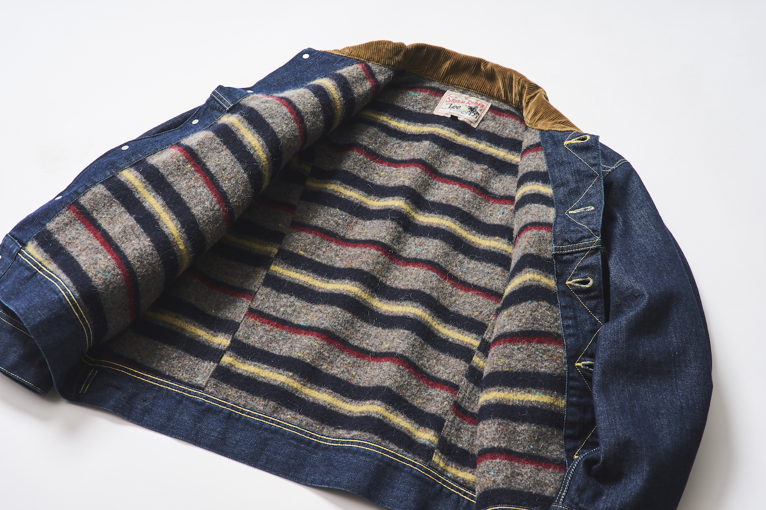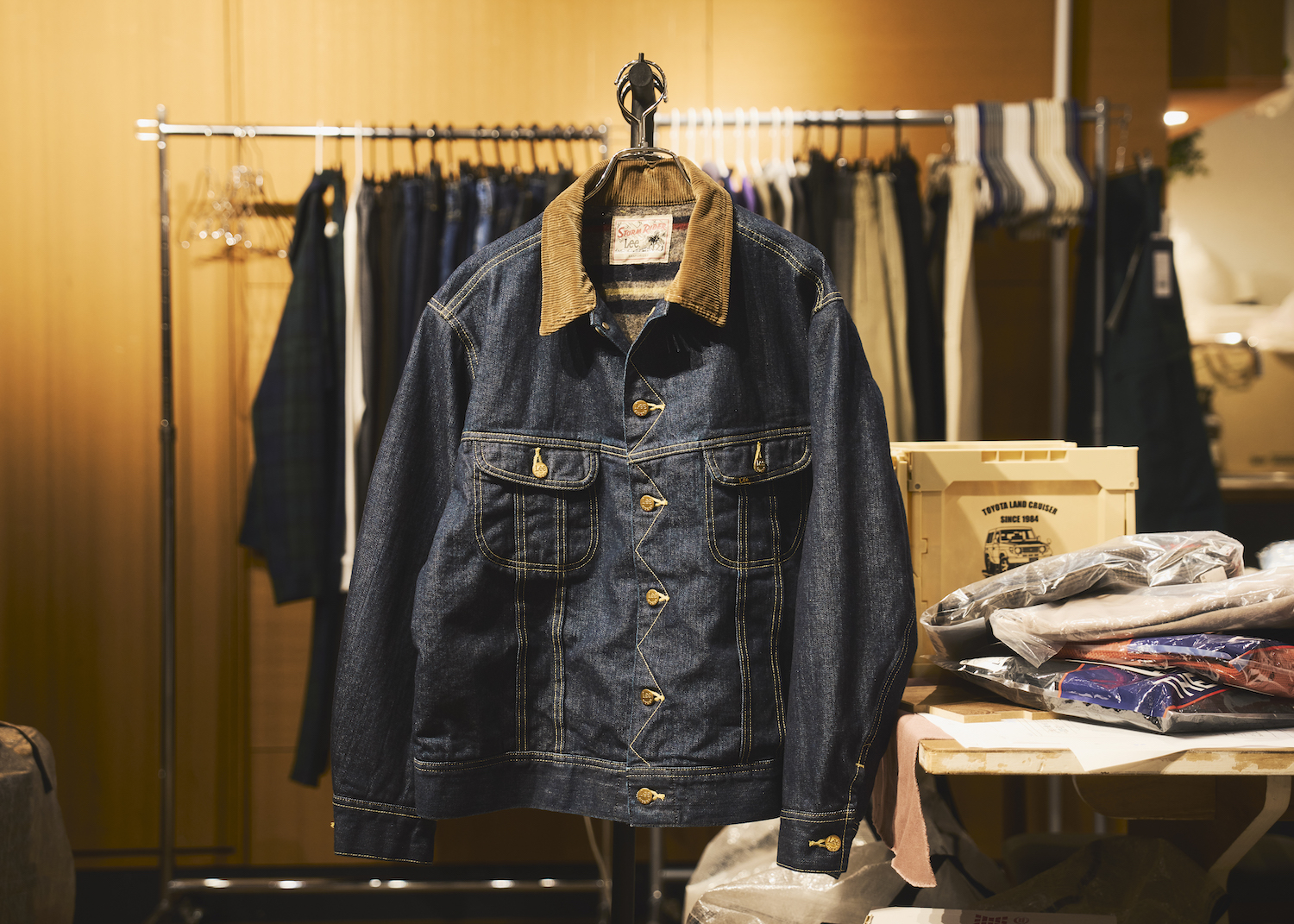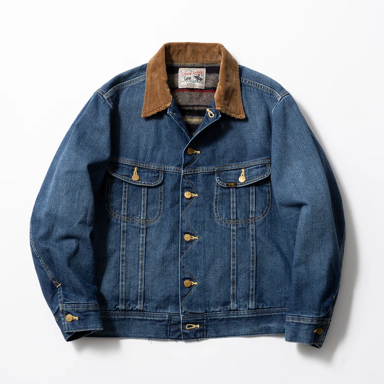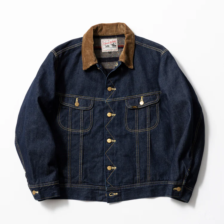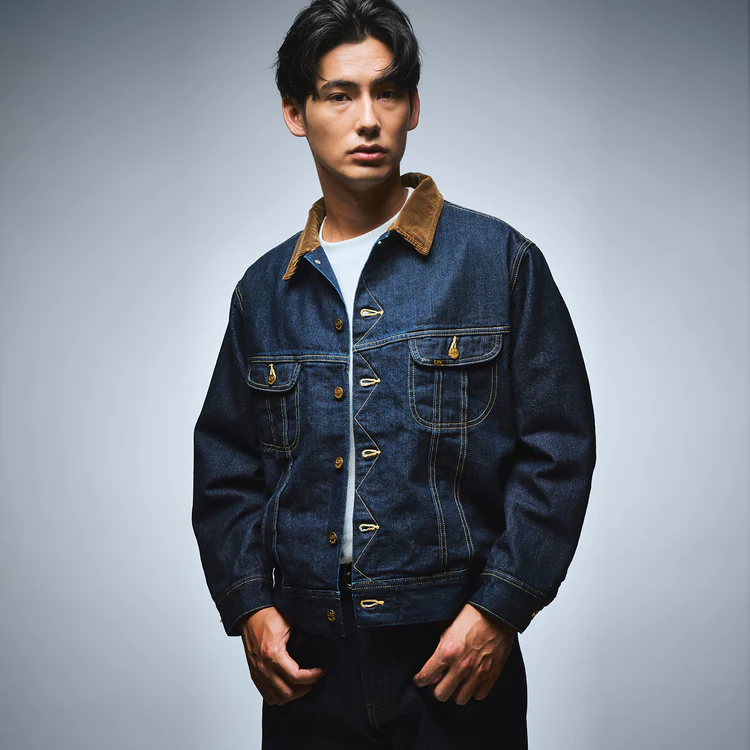 暖色のコーデュロイ襟が首元を包み込み、クラシックな表情と保温性を両立。デニムのワイルドさに上品見えを足してくれる王道ディテール。