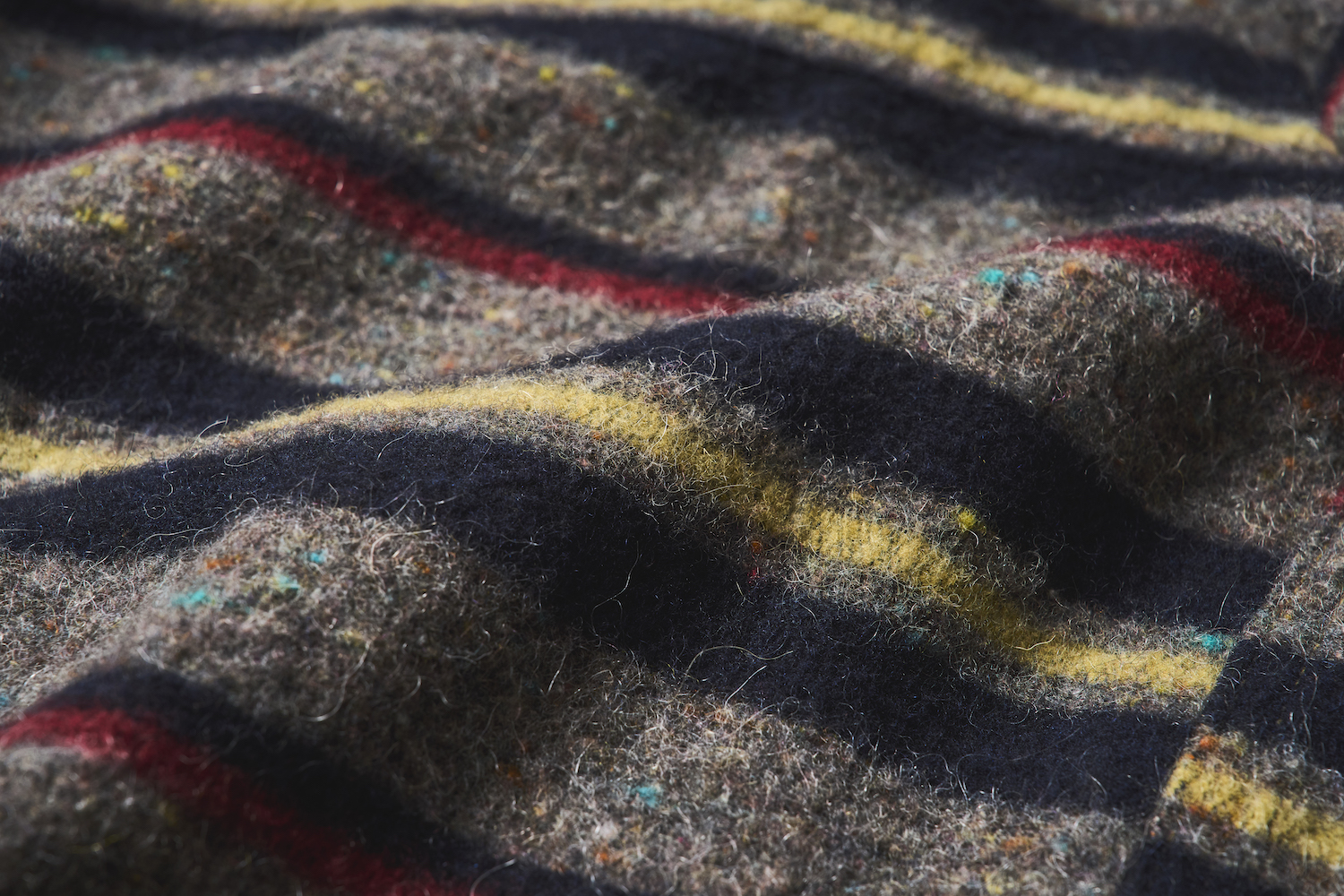 ヨコ縞ブランケットライナーが肩から背中をふわりと包み、外でも暖かさをキープ。毛布のような厚みで肌当たりも滑らか。