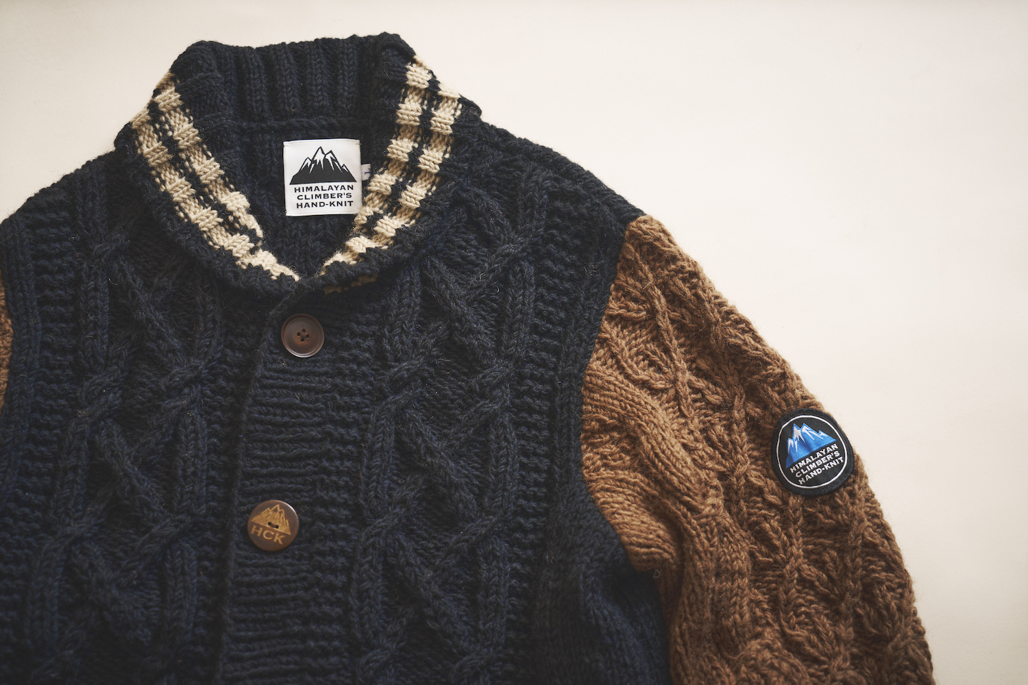世界最高峰の山、エベレストを有すること有名な山岳国ネパール。雄大なヒマラヤ山脈が広がり、昼夜の寒暖差が大きいこの地で生産される「ヒマラヤン クライマーズ ハンドニット」。熟練の職人が手編みで仕上げた重厚なつくりのニットは、月にわずか4着しか編むことのできない希少な品。そんな、たたでさえ特別感たっぷりなニットをオールドスクールなスタジャンの意匠を取り入れた別注アイテムとしてリリースしました!