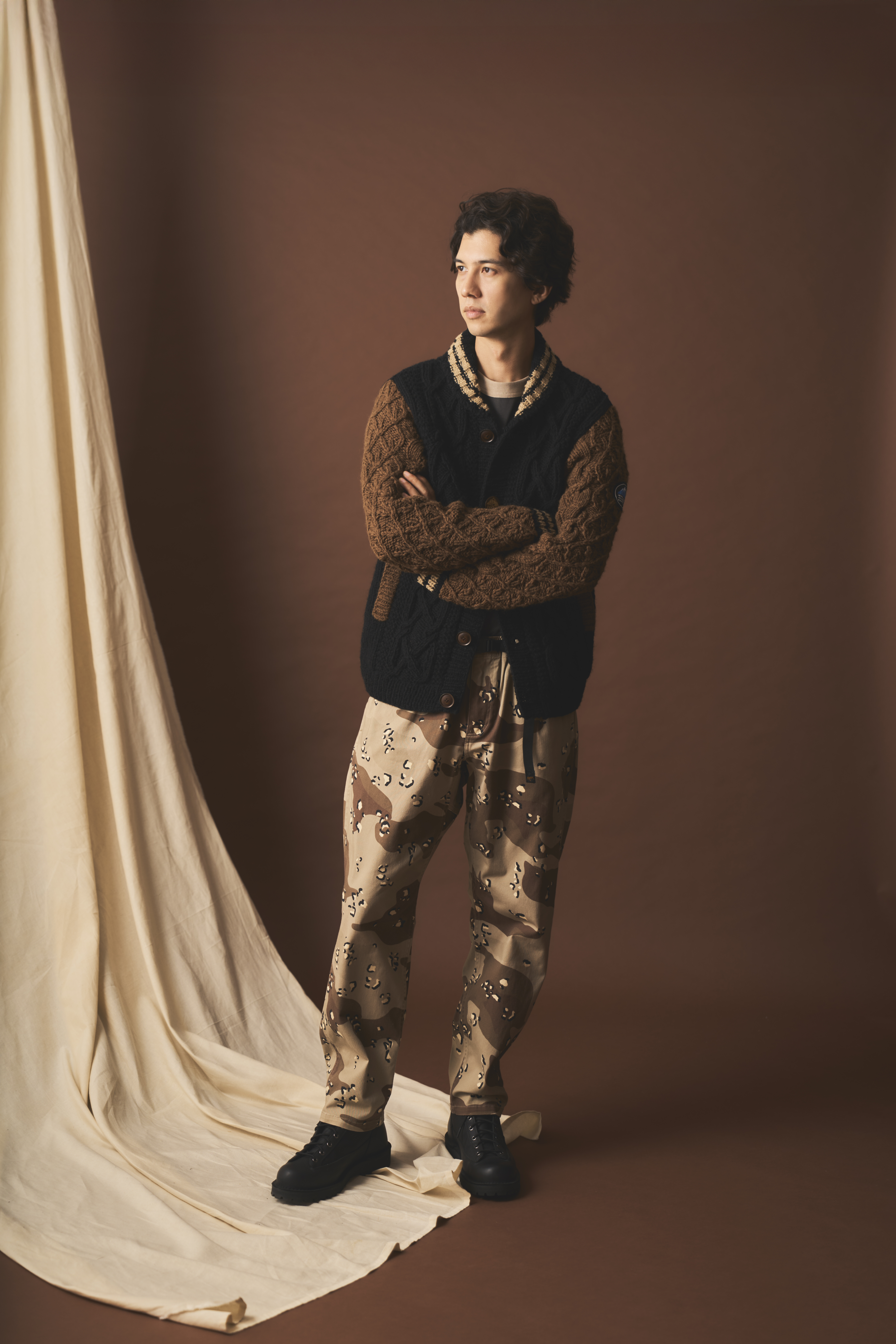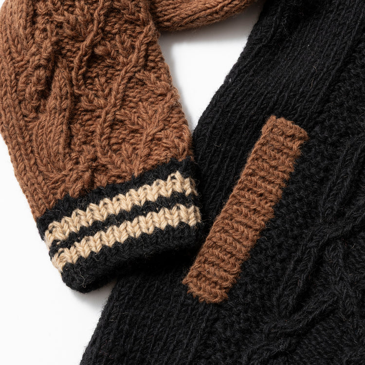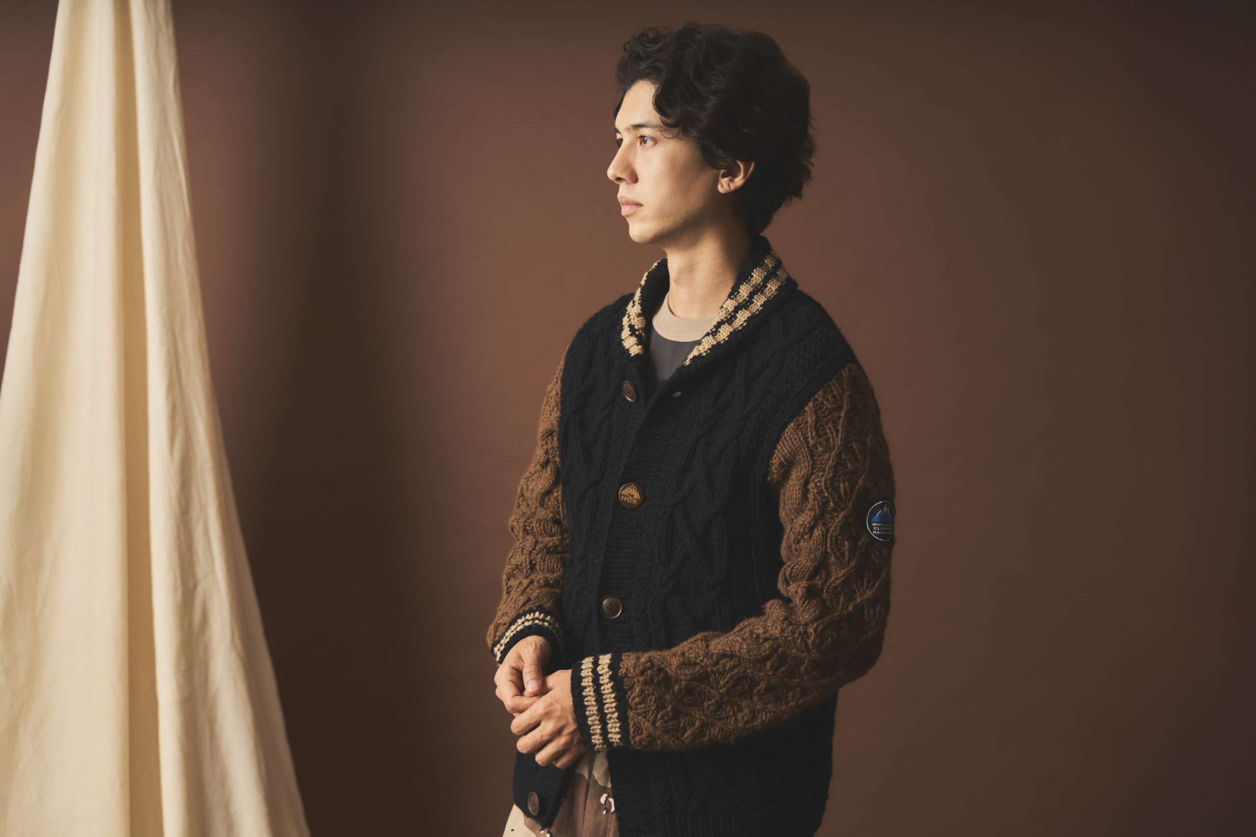 ボディと袖をブラックとブラウンで切り替え、オールドスクールなスタジャンをイメージ。首と手首にベージュのリブを配することで、クラシック感も倍増。ニットの柔らかさとスタジャンのカッコよさを両立した別注ならではの遊び心がグッド。古着との相性も抜群です。