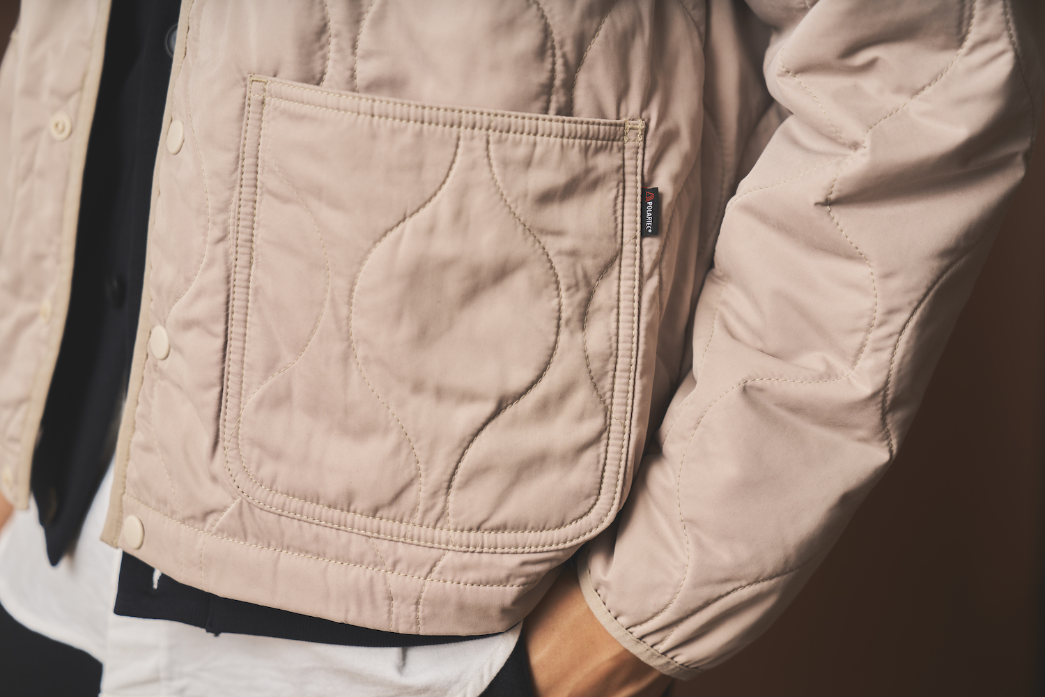 ひょうたん型のキルティングに「POLARTEC® POWER FILL™(ポーラテックパワーフィル)」をインサレート。中空ファイバーの中綿は軽量で、高い断熱性能と優れた耐水性と柔軟性を併せ持つ。100%リサイクル素材から作られているため環境にも優しい。