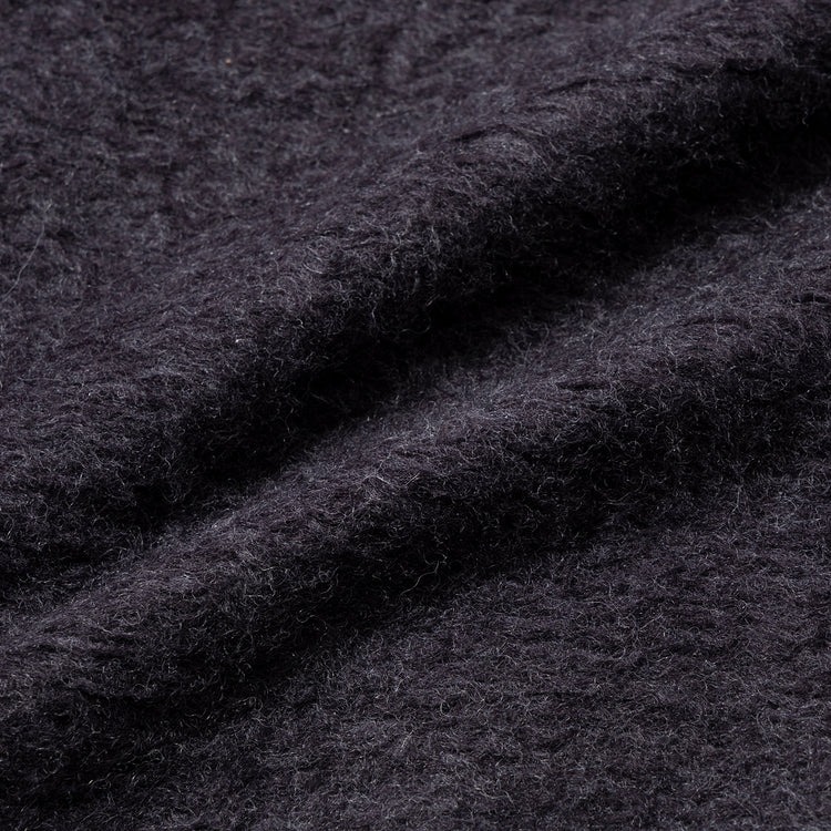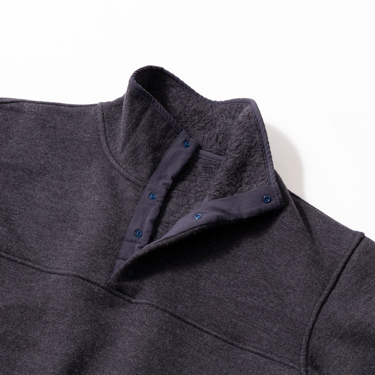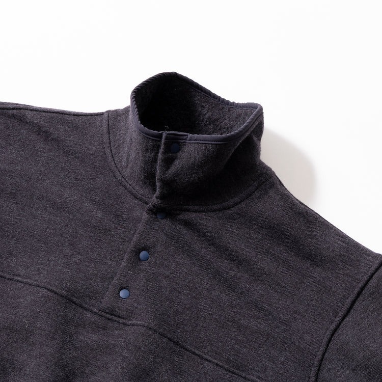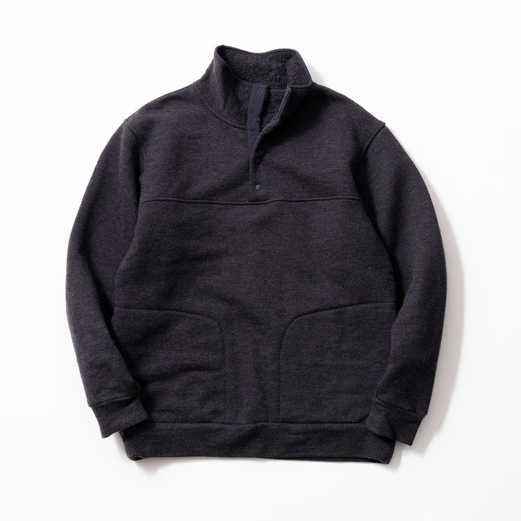 独自配合のアクリル、ウール、ナイロン等の混紡糸で編み立て、スウェットとニットの中間のような質感で仕上げた本作。軽くてボリューム感のある仕上がりで、スナップボタン仕様の首元はベンチレーションの役割も。吊り編み機で丁寧に編まれ、特許技術による特殊な裏起毛で保温性と柔らかな肌触りを実現してくれます。