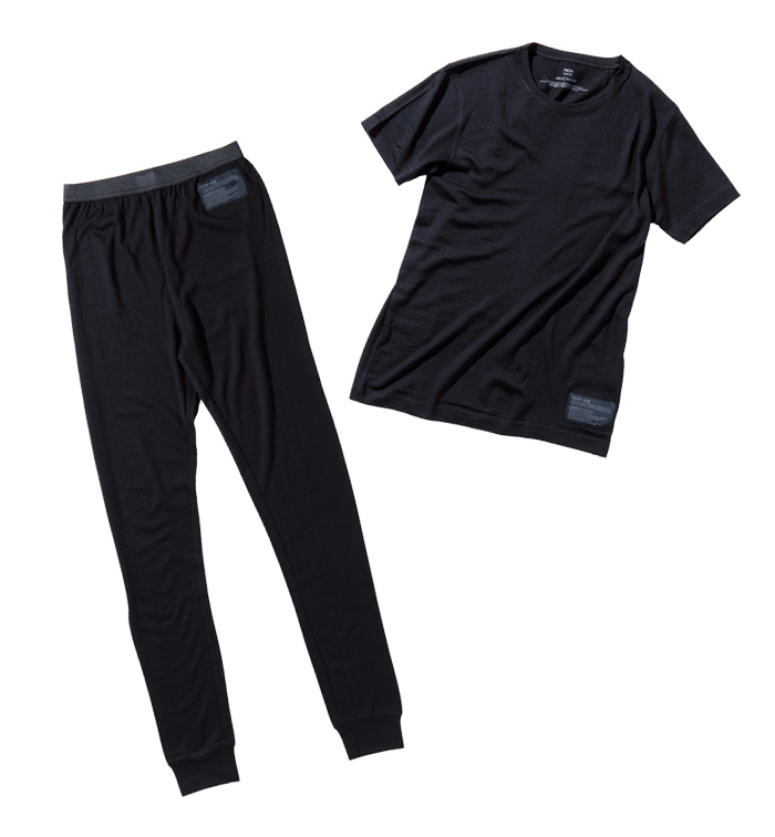 アウトドアでの使用に対応するアイテムを揃える「マウンテンライン」から展開される、本格インナー。インナーダウンと重ねた暁には、極上のヌクヌク仕様に。ブラック、ダークネイビー、アイスグレーの3色展開。長袖ver.5940円。半袖ver.3960円。ロングレギンス5940円(以上、タイオン)