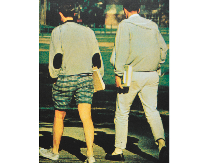 1950~60年代の学生ファッションといえばアイビールックと相場が決まっていた。教科書やノートの類は裸で持ち歩くのが〝粋〞とされ、ブックバンドでこれを束ねる姿もよく見られた。今客観的に見ると……かなり不便そうですな。