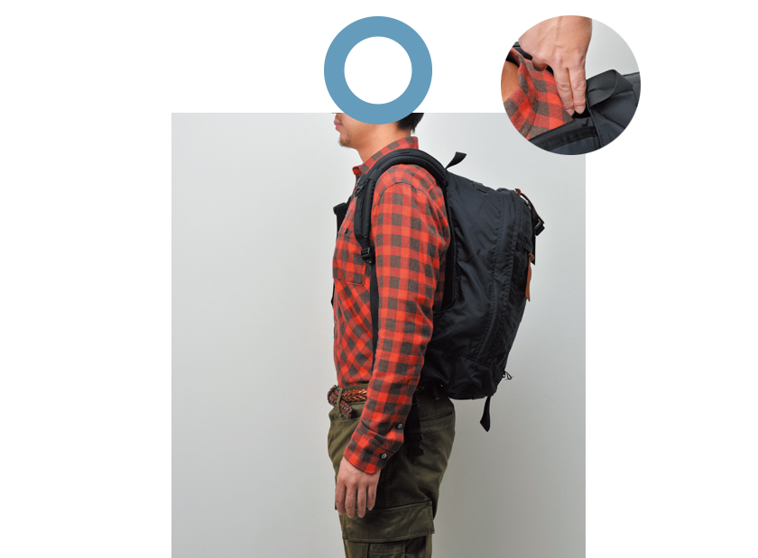正解は高すぎず低すぎずの背負い位置。背中との間に、指2本分ほどの余裕ができる位置にストラップを調整すると、バランスがいい。
