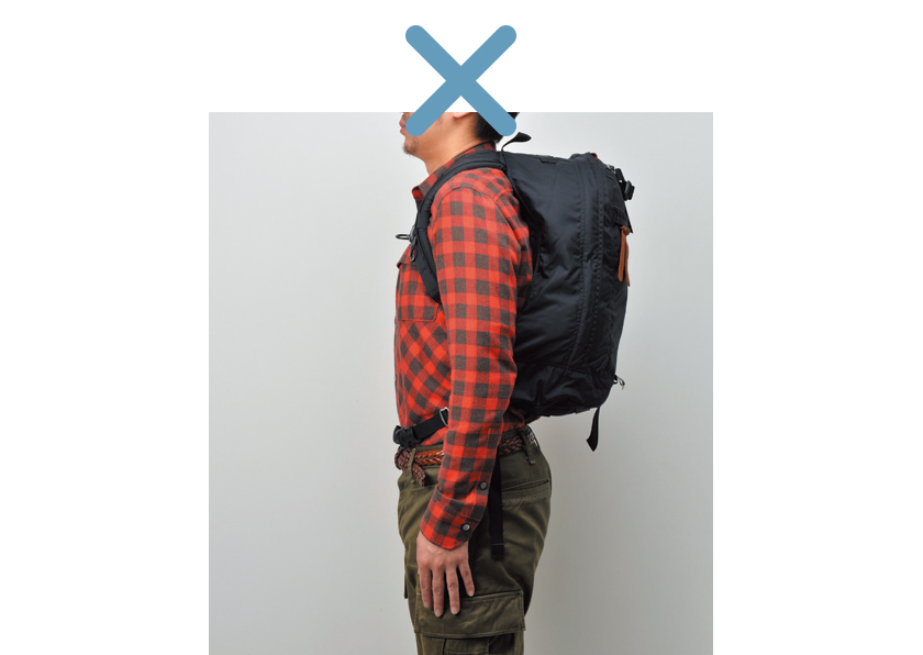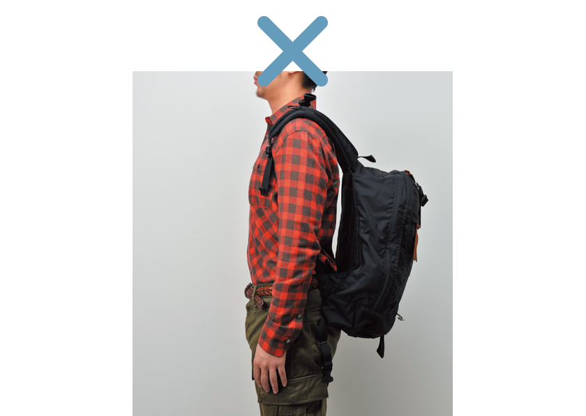 A. 機能面でいえばしっくりくるように背負うのが正解なので、人やモノによって異なるといえるが、ファッション的見地からいえば気をつけるべきポイントはある。それは背負う高さ。デイパックの上部に指2本分ほどの余裕が生まれる高さで背負うと、最もバランスよく見えるのだ。理由のない限り、↓のNG例はゆめゆめ避けるように。