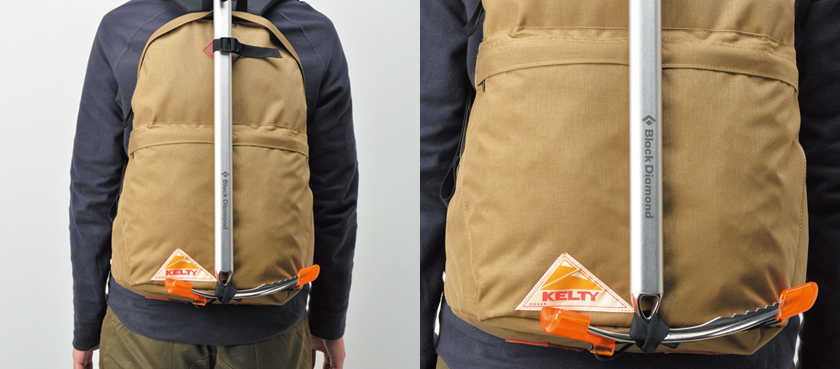 菱形の革パッチに2本のスリットが入った通称〝ブタ鼻〞。スリットはラダーストラップを通すためのもので、ピッケルの柄を固定するのにこれを用いる。このときにピッケルはデイパ下部のループから通し、落ちることのないよう、ループをねじって固定する。