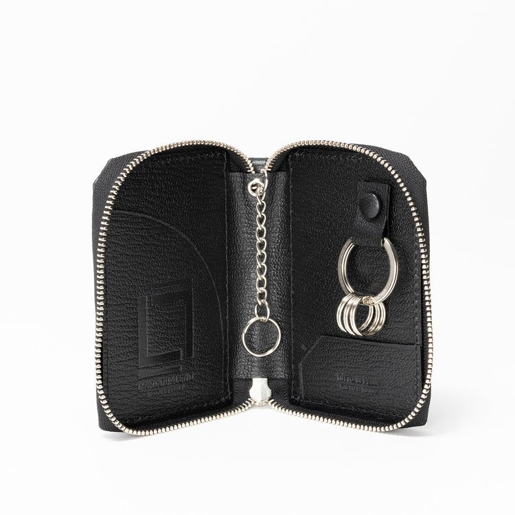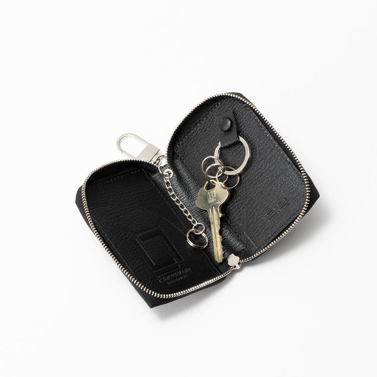 内側に設置された落下防止チェーンには絶対落とせない鍵を、スナップ式のキーリングには取り外す頻度の高い鍵を装着。外装には、400年超の歴史を誇る日本の代表的な伝統工芸のひとつ、「甲州印伝」を採用!極めて高い技術を要する伝統工芸士の資格を持つ山本裕輔氏(印伝の山本)が、精緻な手作業で柔らかな鹿革に漆付けを行っています。