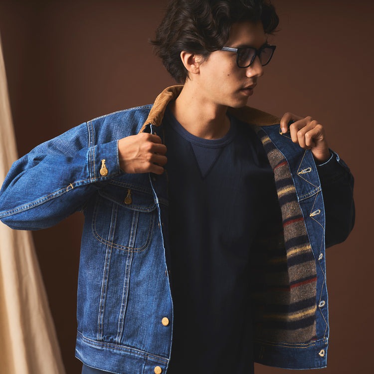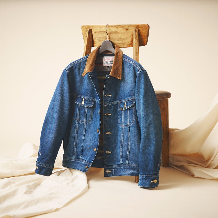 Leeの名作101-Jのデザインを継承したブランケットライナーのストームライダー。吹雪の中を行くカウボーイの姿が描かれた襟タグもポイントです。肉厚で安心感のある13オンスのデニム生地を使用しています。着用するほどに体に馴染み、趣のある色落ちを味わえます。保温性を確保するためのブランケットライニングとコーデュロイ地の襟は秋冬にもピッタリな雰囲気に。
