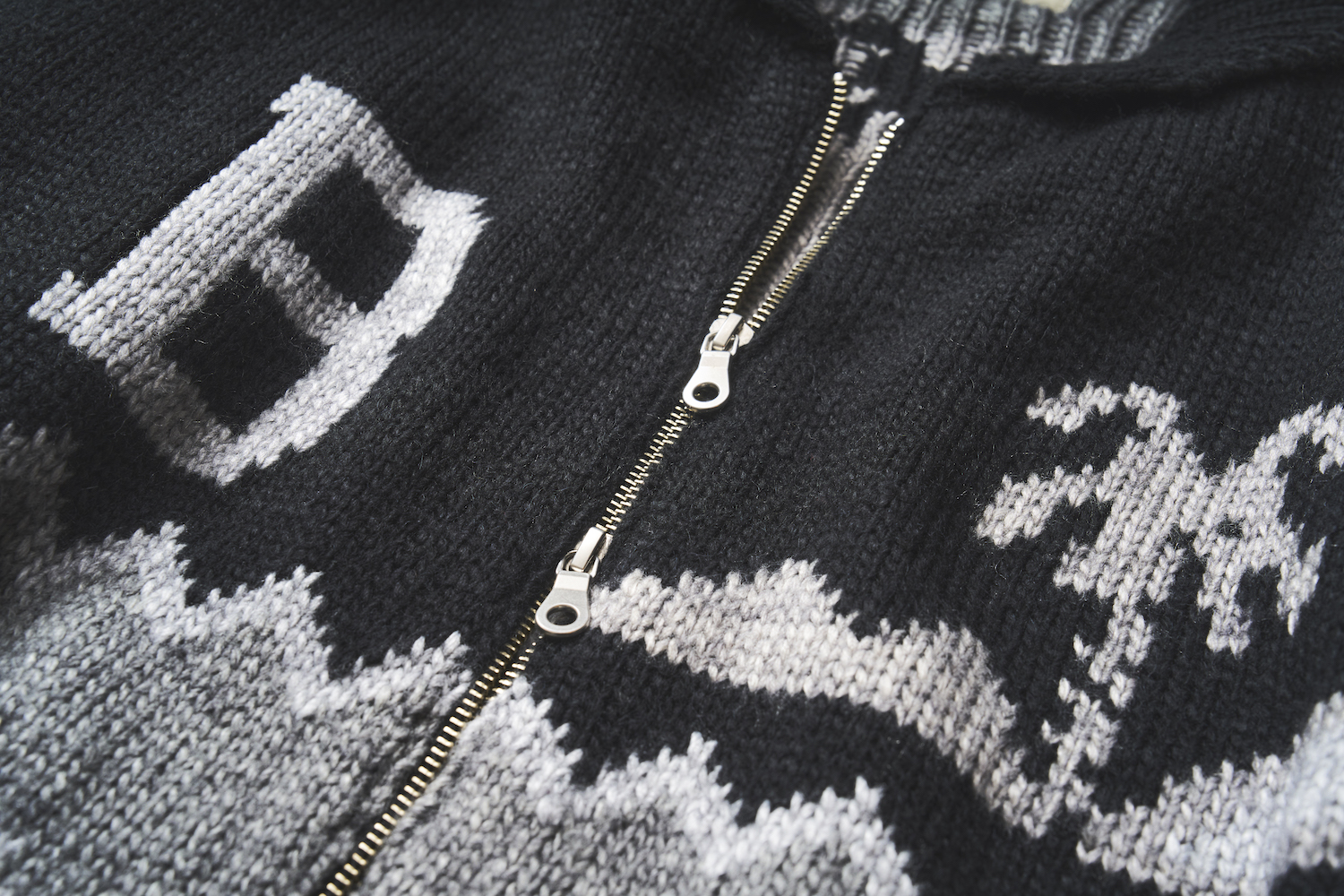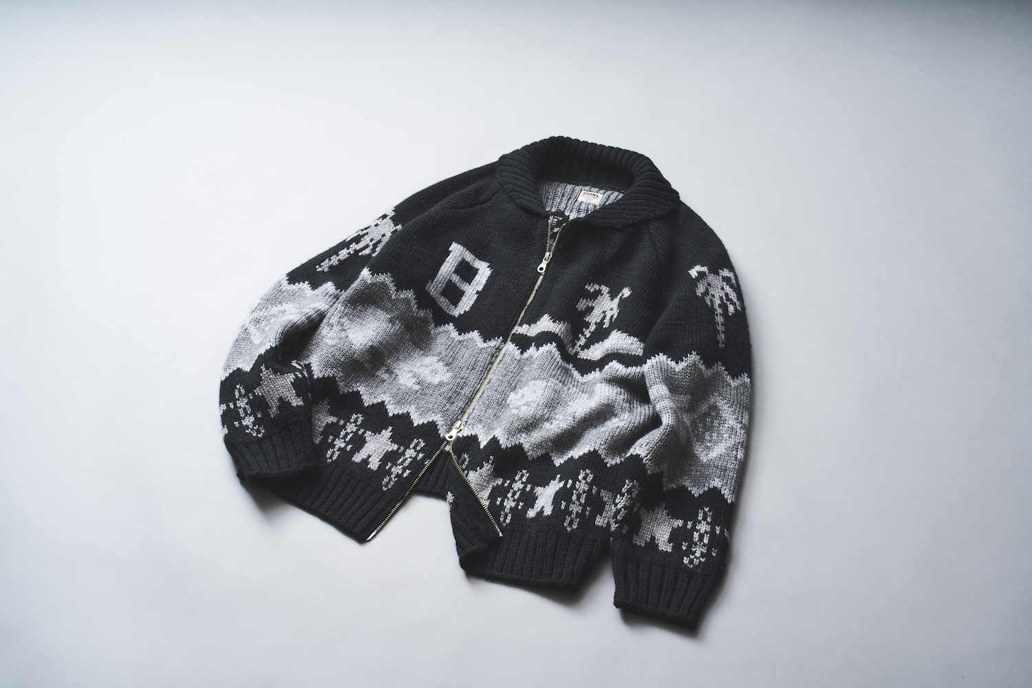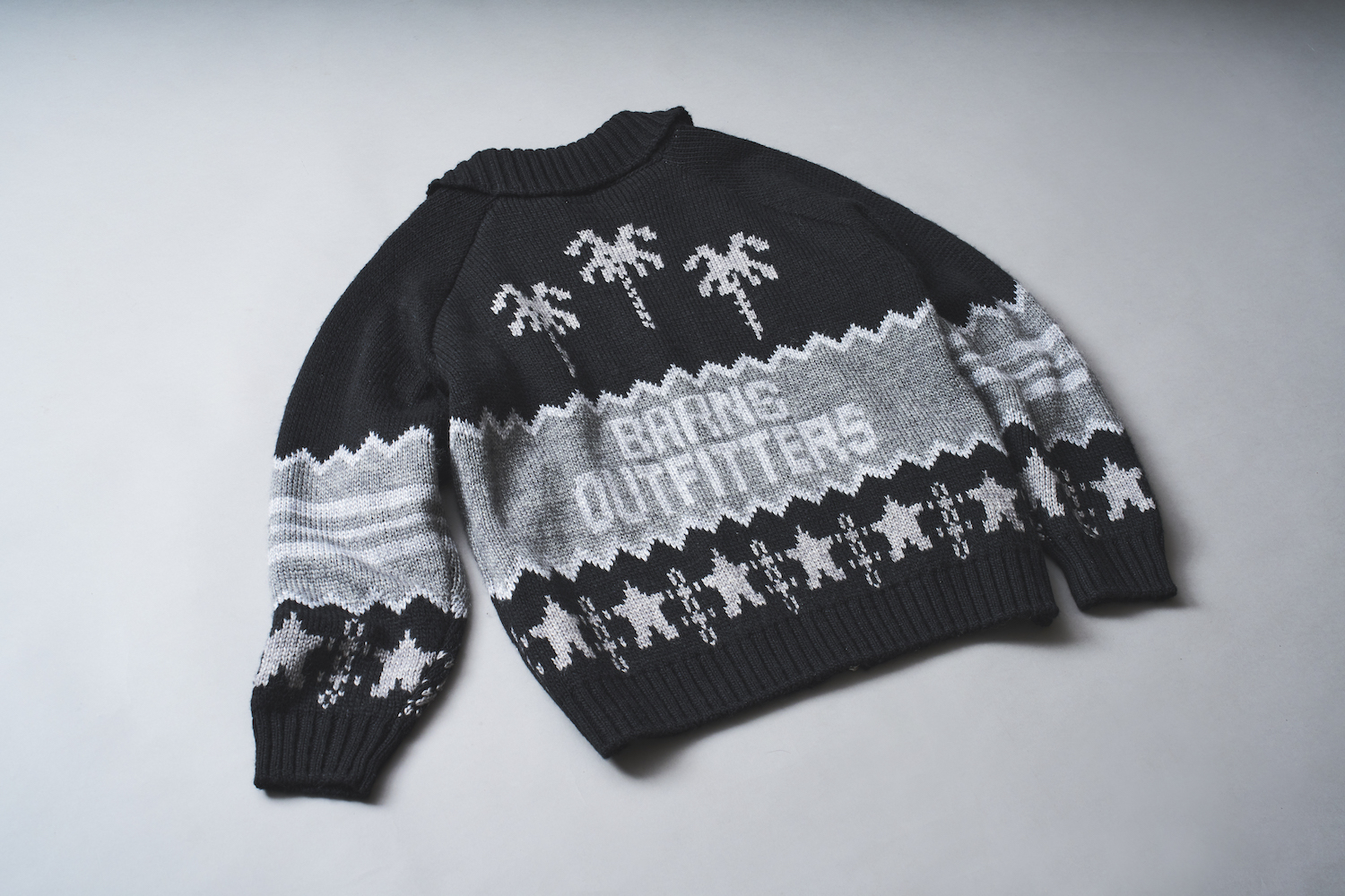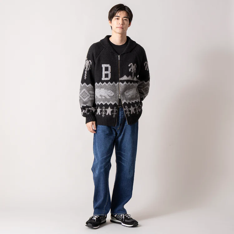 冬に欠かすことのできないアウター類。ダウンやコートといった定番アイテムもいいけれど、第三の選択肢として提案したいのが、カウチンセーター。カウチンセーターとは、カナダのバンクーバー島にあるカウチン湖の湖畔に定住したカウチン族が狩猟や漁業で着用していたとされるもの。そんな伝統あるセーターをダブルジップ&ラグランスリーブでバーンズが現代的にアレンジ。温暖で雨の多い気候が似ていることから、バンクーバー生まれのカウチンセーターに、カルフォルニアの州旗のデザインを落とし込んでいるというのも何ともユニーク。ブランド名の頭文字「B」を右胸に配置した遊び心も見逃せないポイントです。