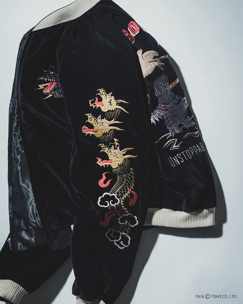 背面には“GODZILLA”のタイトル、さらに富士山をどんと構えて、その上空を「ラドン」と「モスラ」が舞う。地上では公害怪獣「ヘドラ」がゴジラを待ち受ける、という怪獣総力戦の構図。前も横も後ろも、視線が休まる暇なし。刺繍でここまで詰め込んでくるのが、さすがのテーラー東洋別注!