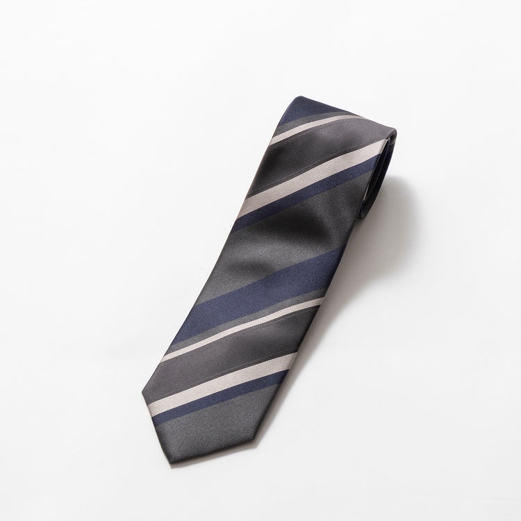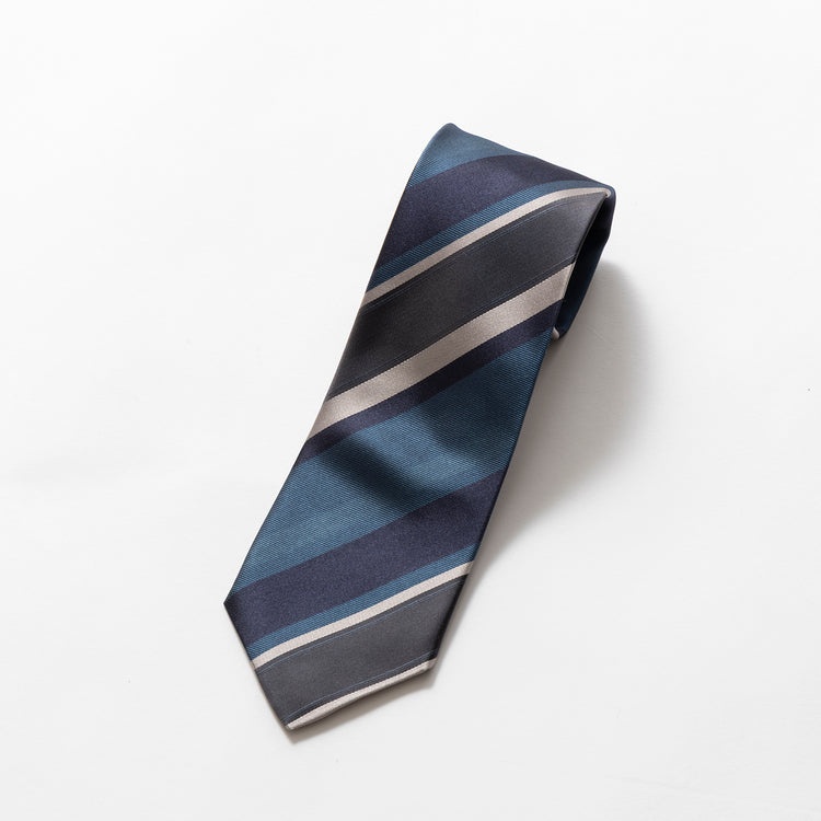 イタリア北西部コモで生産されたClassico Seta社製のシルク100%生地を使用した本作。経糸にチャコールグレーを使い、落ち着きのある色合いとなっています。4色のストライプ部分はそれぞれ織組織に変化を加え、独特の表情を生み出しています。