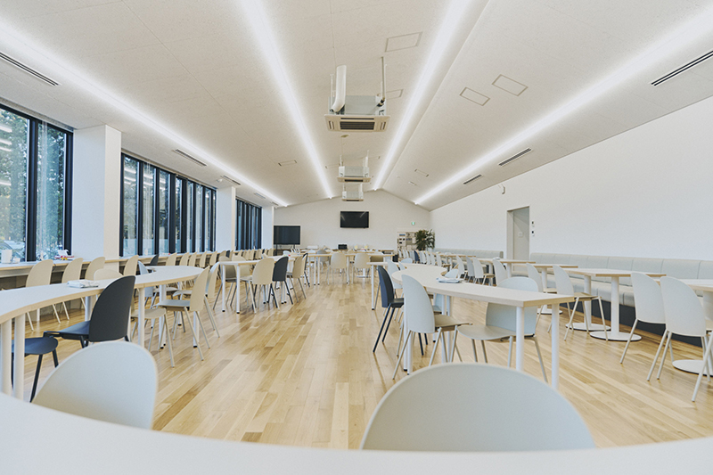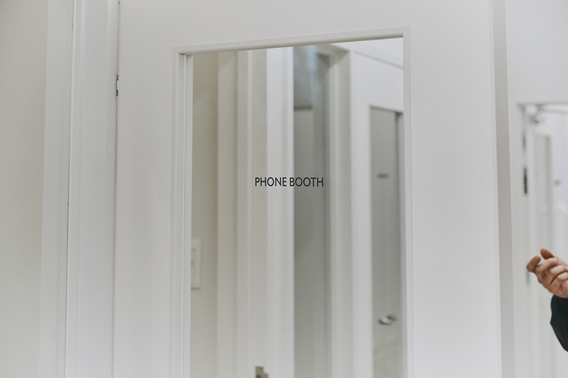 広々としたダイニングホールは一度に140人が座れる大食堂で、グループで談笑できるテーブル席から、一人静かに過ごせるカウンター席、靴を脱いでリラックスできる小上がりまで、多彩なスペースが設けられています。加えて、工場内には電話ブースがいくつも設置されており、学校や保育園などからの連絡にもすぐ対応できるように。