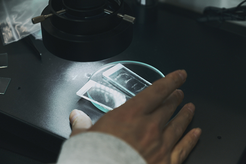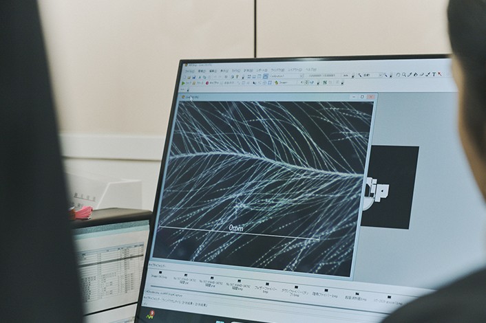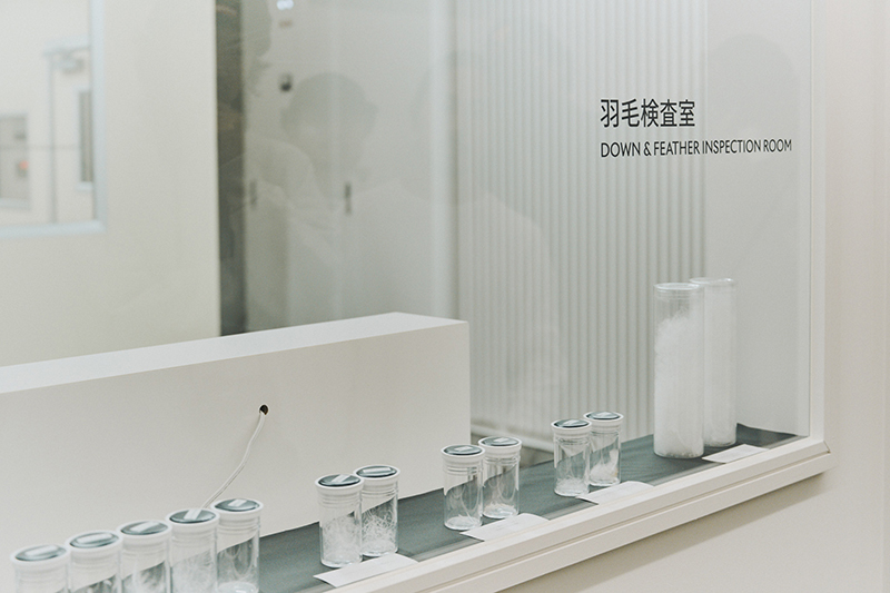 「羽毛検査室」では、水鳥以外の羽毛が混入していないかをチェック。水沢ダウンではフランスから取り寄せた高品質なものを使用していますが、まれに水鳥ではない陸鳥由来の羽毛が混ざっていることがあります。肉眼では判別が難しい異物混入も、顕微鏡レベルで徹底的に検査し、品質にコミットしているとのこと。