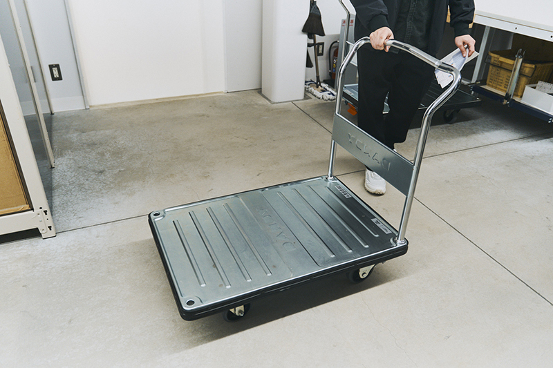 工場内は完全バリアフリーで段差がなく、各工程間の運搬も重要な作業と位置づけて台車を多数配置。ラックや作業テーブルもすべて可動式で、高さも個々の好みや体格に合わせて調節できます。