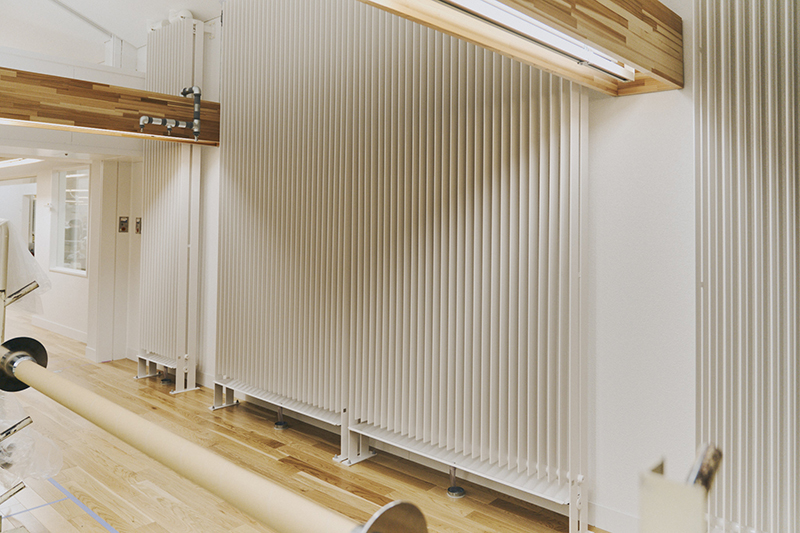 そこで新工場では「輻射熱冷暖房」を採用。壁一面に埋め込まれた水循環式のパネルから放射される熱で温度調整する仕組みで、風を感じることなく一年中安定した室温を保つことができるのです。おかげで羽毛が空中に舞うこともなく、ミシン作業中の糸があおられる心配もゼロ。さらに冷暖房の熱源には奥州市の豊かな地下水を利用しているとのことで、環境にも配慮している点には驚きました。