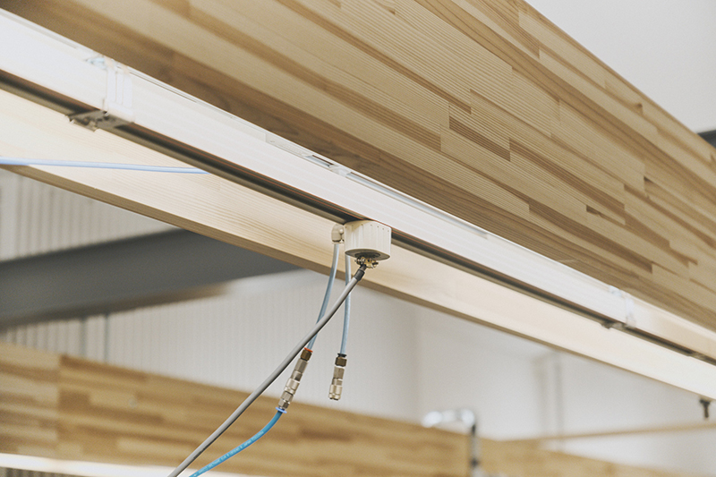 上の梁を見上げると、ファクトラインと呼ばれる構造が設けられていました。電源ケーブルやエアーコンプレッサーの配管が通されており、ミシンなどの機械をどこへでも動かすことができるという代物。