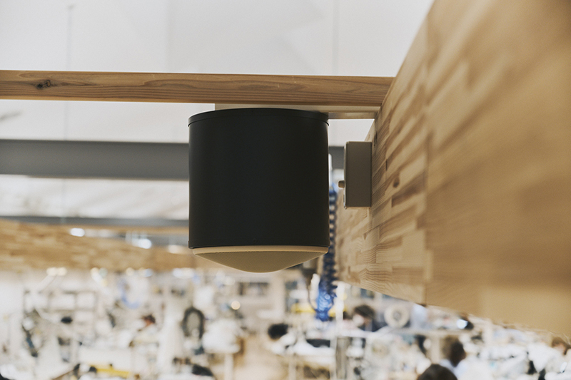 高い天井と木の温もりを感じるワンフロア空間には大きな柱もなく、床は隅々までフラット。生産ラインごとに十分なスペースが確保され、縫製機械の配置換えも自在にできるよう設計されています。