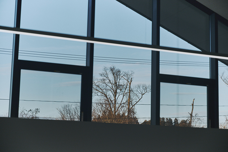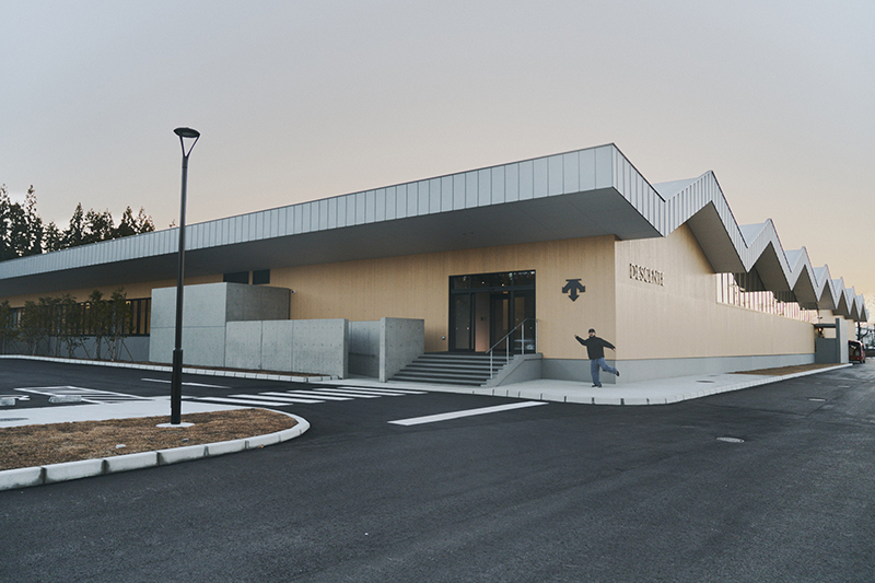 外観には地元の岩手県産の木材がふんだんに使われ、周囲の景観に溶け込む落ち着いた雰囲気。連続する三角形の屋根は、この地域に古くから見られる木造の蔵から着想を得たデザインです。