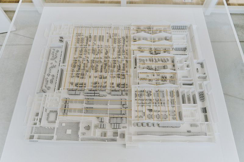 旧工場では点在していた8棟の建物を、1棟ワンフロアの新工場に集約。床面積は旧工場比で1.5倍(約5098㎡)に拡張され、材料の入荷から最終製品の出荷までをコの字型に配置した導線設計で、生産性を極限まで高めています。
