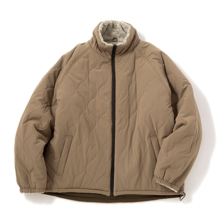リバーシブル仕様の中綿入りのボアブルゾン。表はふかふかのメランジボアフリースとなっています。裏は撥水加工入りのストレッチナイロンで雨の日も安心。