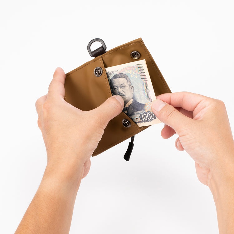 防水性能は5万mm!軽量&コンパクトでアクティブシーンにマストこちらミニ財布。Dカン付きだからバックパックやカラビナと合わせて使えて便利です! 片側にマチを設けたコインポケットで小銭の出し入れもスムーズ。