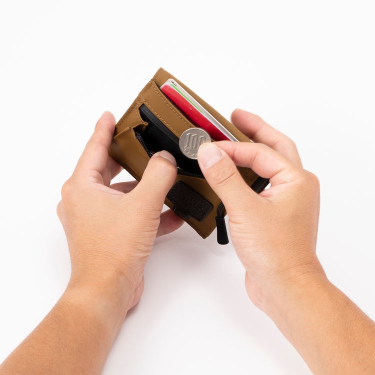 防水性能は5万mm!軽量&コンパクトでアクティブシーンにマストこちらミニ財布。Dカン付きだからバックパックやカラビナと合わせて使えて便利です! 片側にマチを設けたコインポケットで小銭の出し入れもスムーズ。