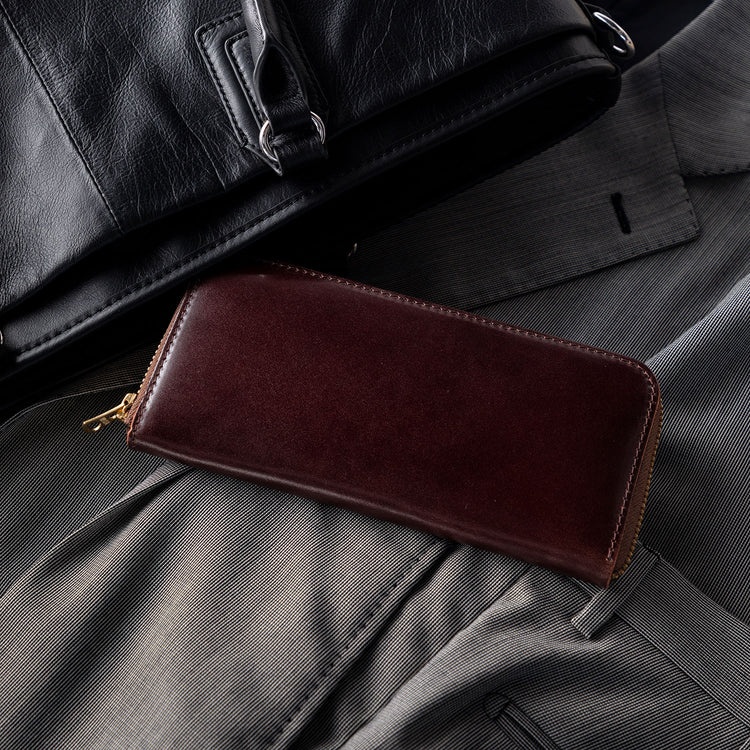 財布のミニサイズ化が進んでいますが、ロングウォレットの安心感は永久に不滅。新調を考えているあなたにおすすめなのが、東京発のアメカジブランド「バーンズアウトフィッターズ」のオリジナル。レザーは世界屈指の馬革専業のタンナーが鞣したコードバンを使用。