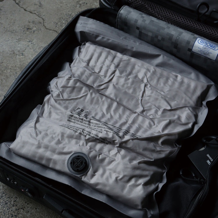 耐久性が高く見た目にもスタイリッシュなトラベル圧縮袋。一般的な透明の圧縮袋の生地の約3倍の厚みのオックスフォード生地を使用しています。上部のスライダーで開け閉め。袋を丸めて中の空気を下部のロック式排気弁から排出することで圧縮も可能。