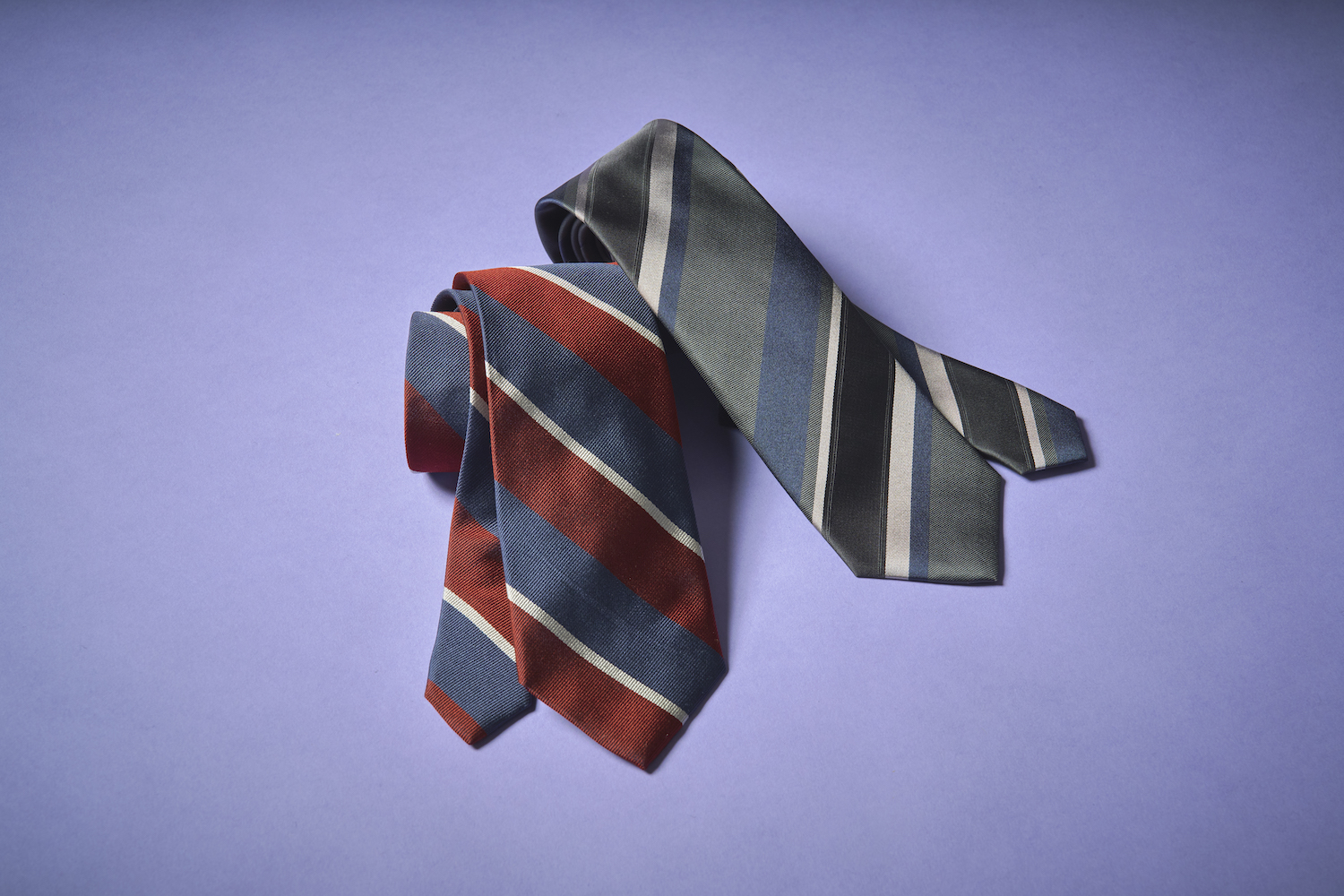 今回ご紹介したレジメンタル(左)以外にも柄違いのストライプ(右)もご用意。シーンやシチュエーション、お好みに合わせてお選びください。