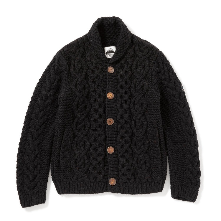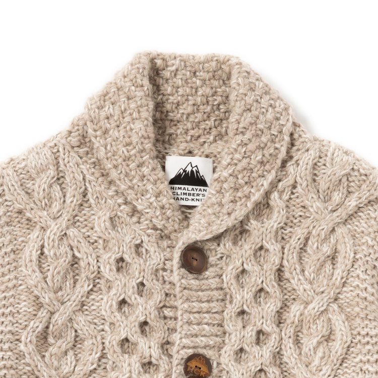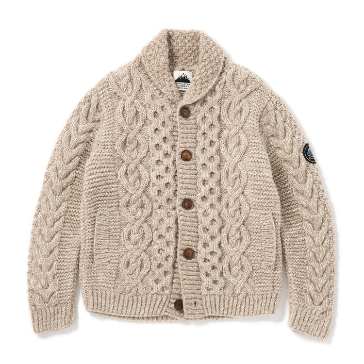 ヒマラヤの登山者とハンドニットの歴史を背景に誕生した、「ヒマラヤヤンクライマーズハンドニット」のショールカラーカーディガンのこちら。一ヶ月で一人につき4着しか生産できない手編みの極厚セーターです。