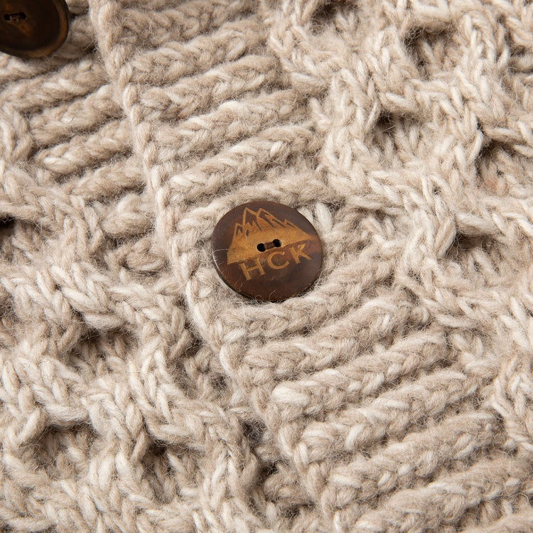 ニュージーランド産の良質な素材をネパールで紡績したウール糸を使用、着込めば着込むほど身体になじむレギュラーシルエット、水牛の角から手彫りしたボタンを使用しています。