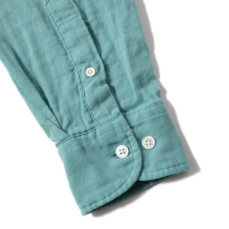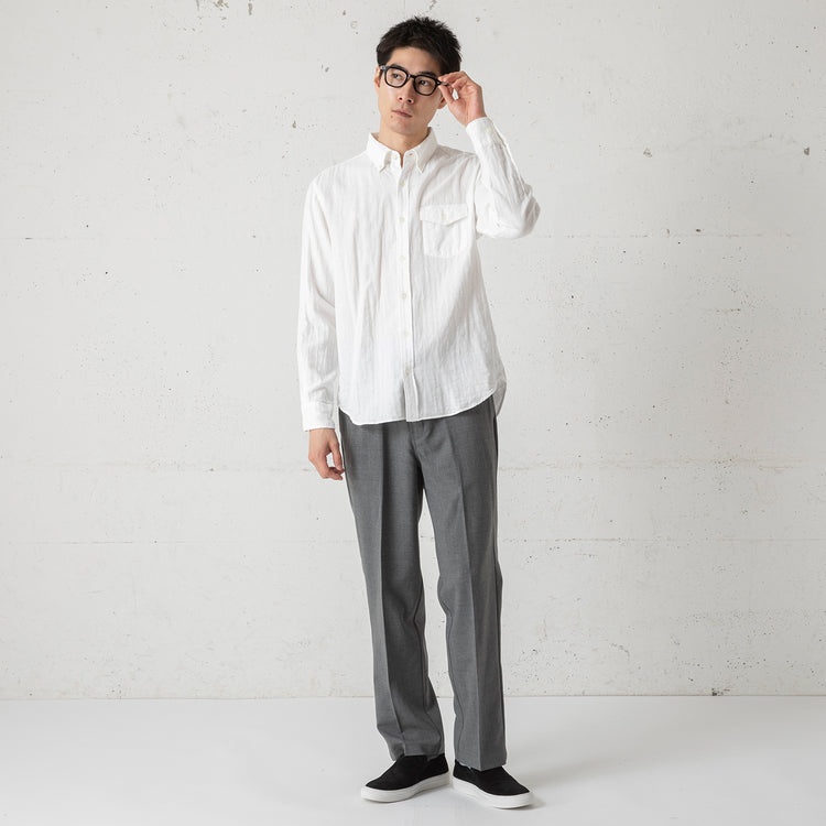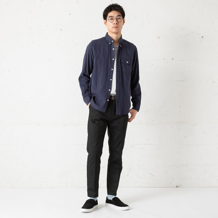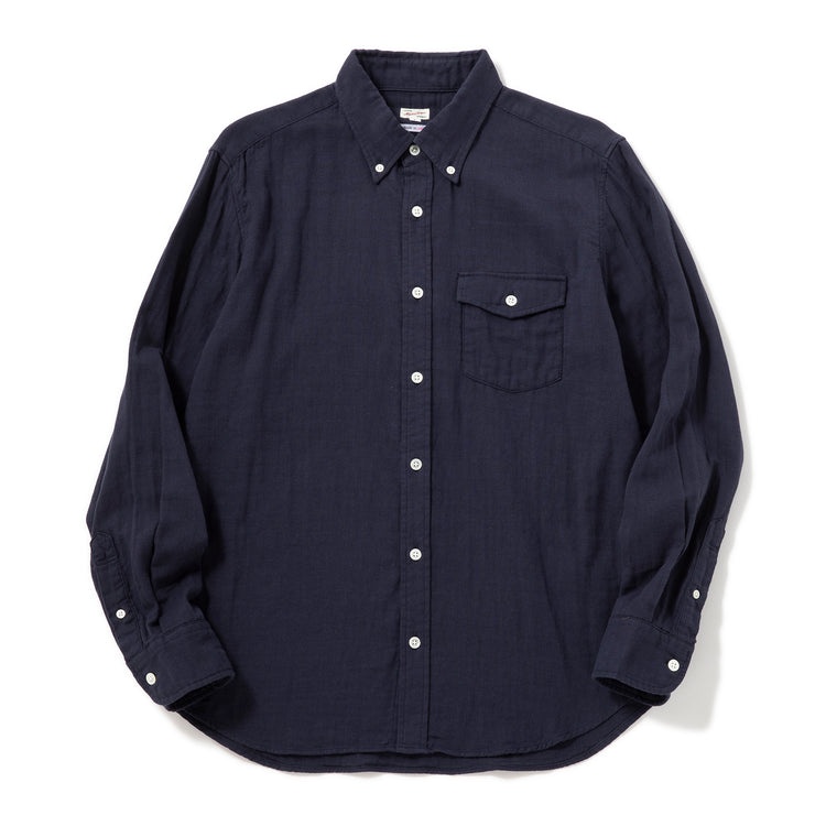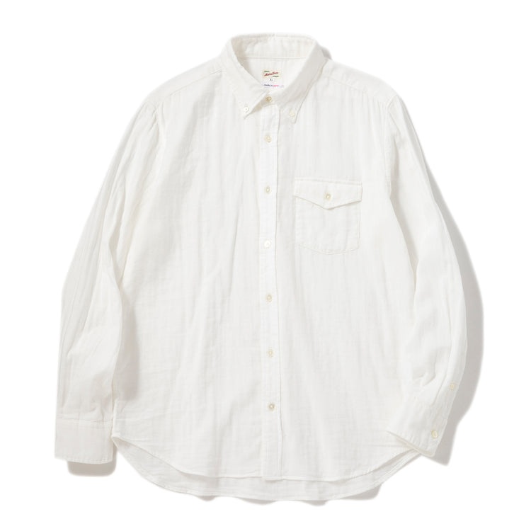 オールシーズン着用できるダブルガーゼのボタンダウンシャツ。生地調達から縫製、仕上げまでの全工程を日本国内で完結して生産。薄いガーゼを二重にしたふんわりとした軽やかな生地が魅力。夏は通気性と吸水速乾性、冬は保温性を発揮します。ややゆったりとしたシルエットで、ストレスフリーな着心地が◎。