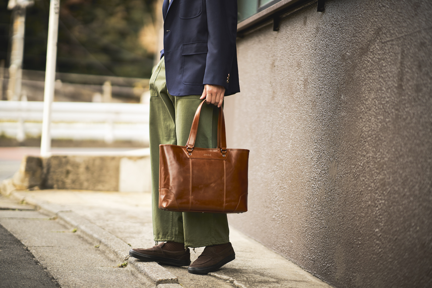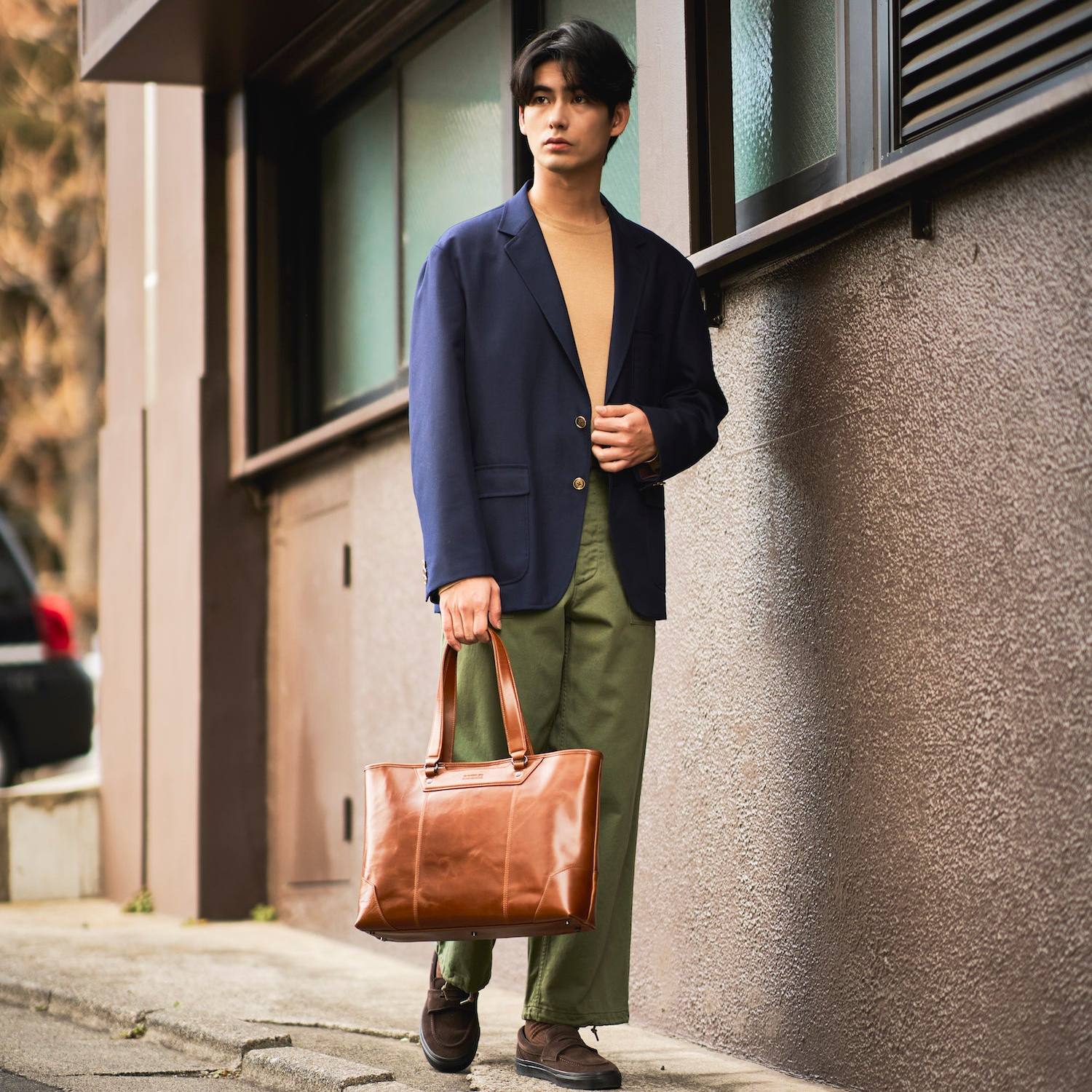 ビジネスウェアのカジュアル化が進み、オンとオフの境界が薄れたいま、最も頼れる相棒は「品よく使える」トートです。ダブルスのレザートートバッグならば、光沢感のあるオイルレザーが味わい深く、さりげない上質感を演出。熟練のスタッフが一針一針丁寧に縫い上げた、オン・オフ対応の大人のレザートートとなっています。