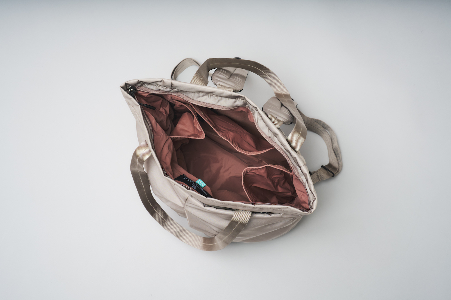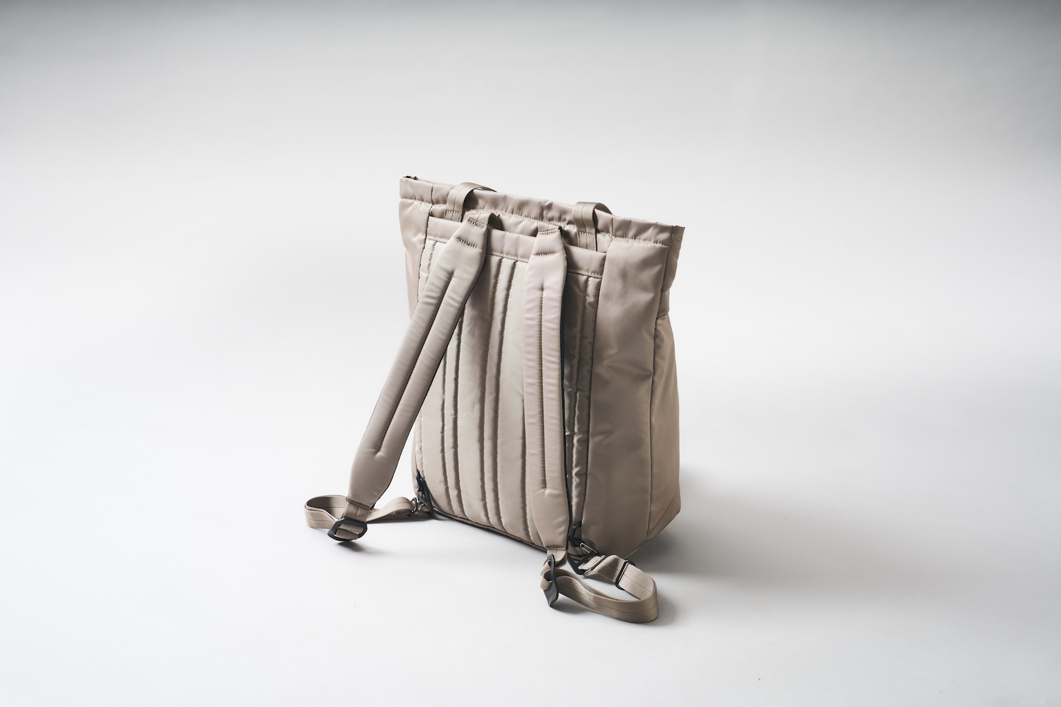 トートバッグにもリュックにもなる2WAY設計。シーンに合わせて持ち方を切り替えられ、汎用性抜群。素材には、海洋廃棄物由来のリサイクルナイロン生地を採用しているので環境にも優しい。