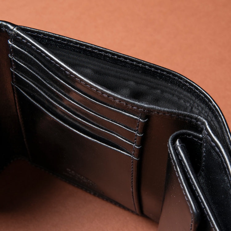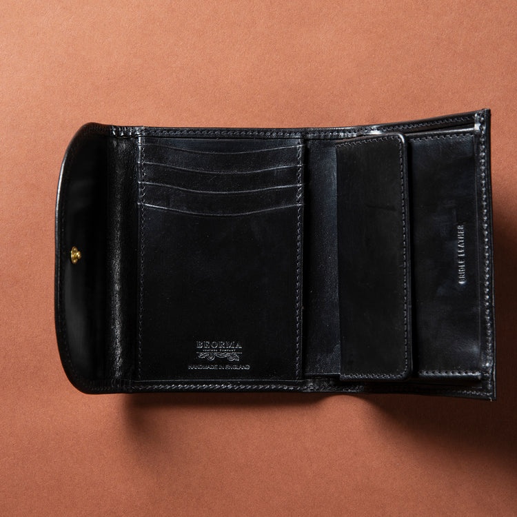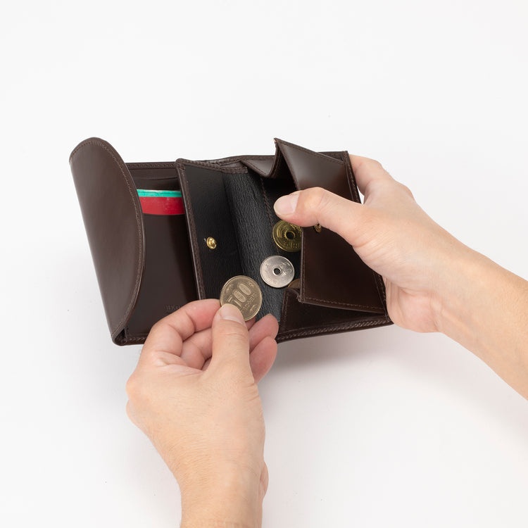 ラウンドしたフラップがアイコニックな三つ折りウォレットです。 抜群の収容力がありながら、携帯しやすい手頃なサイズ感もポイント。 札入れと大型のコインケースのほかに4室のカードポケットと3室のマルチポケットを装備しています。 コインケースはマチ付きで、中が見やすく小銭が取り出しやすいのも◎。 イングリッシュブライドルレザーは、使うほどに次第に手に馴染み、経年変化によって味わいと美しさがアップします。