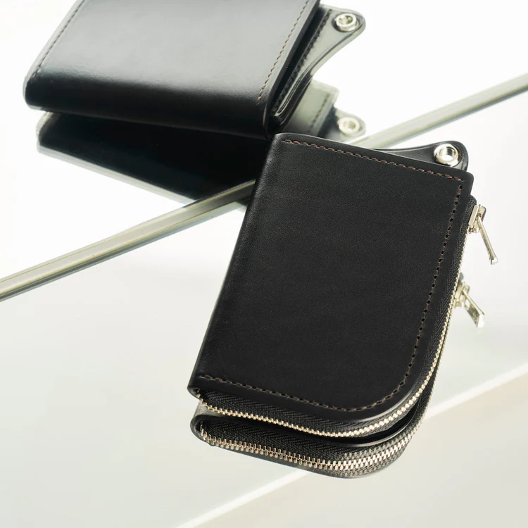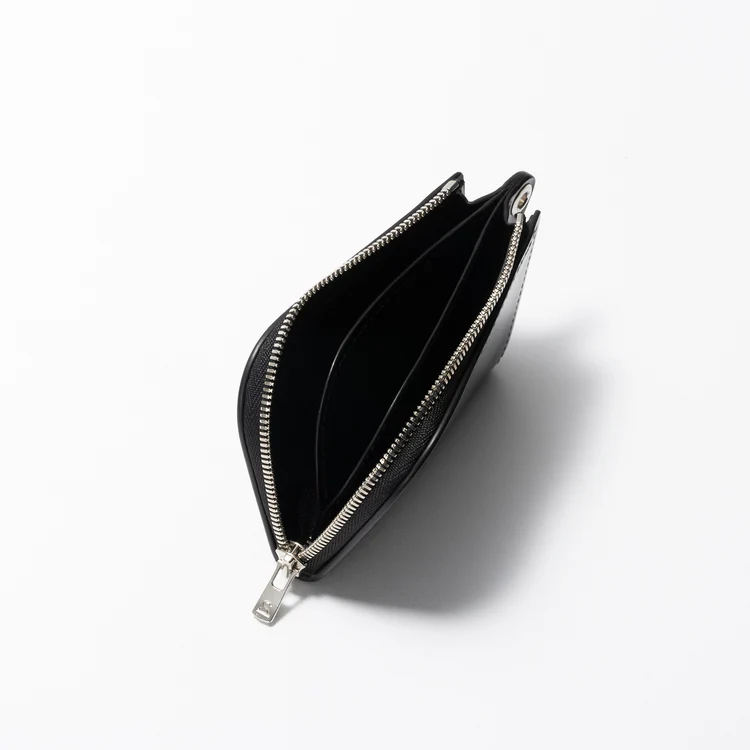 きれいなコバの処理や内装全てのパーツに裏張りを施し、革の床面が見えない仕様にするなど、細かなところにも職人による丁寧な仕事ぶりが伺える逸品。ワンアクションで全ての収納部にアクセスできる手軽さと品格が共存する珠玉のL字ウォレット。