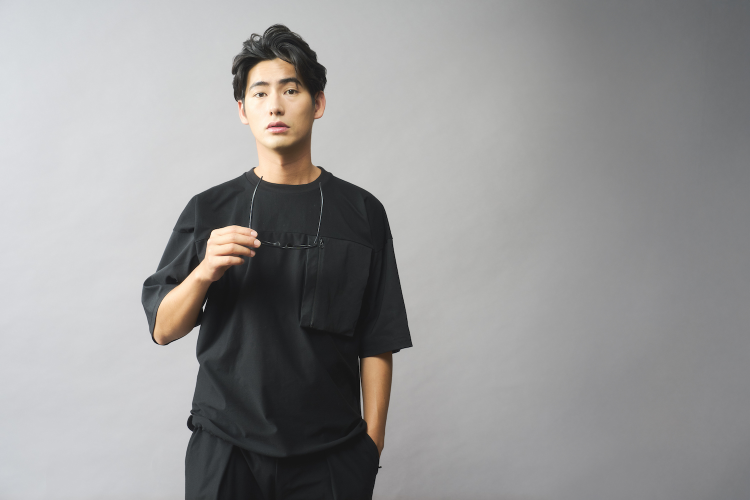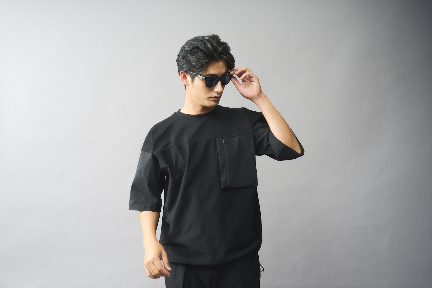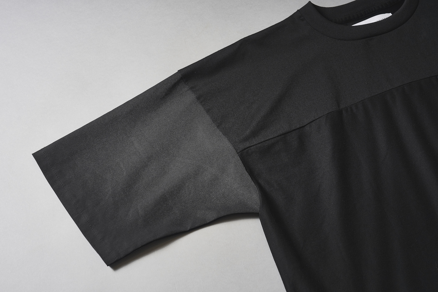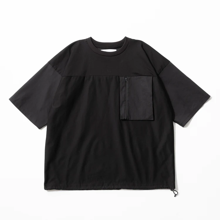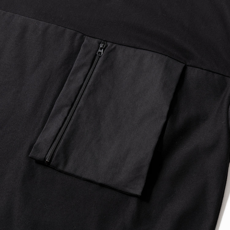 袖に使った和紙混紡生地は、通気性・吸湿・速乾に優れたドライタッチな質感。消臭・抗菌性に加え、毛羽立ちや静電気も抑えてくれる。黒一色ながら、カットソーと布帛の切り替えでツートーンのように見え、大人のこなれ感がある。