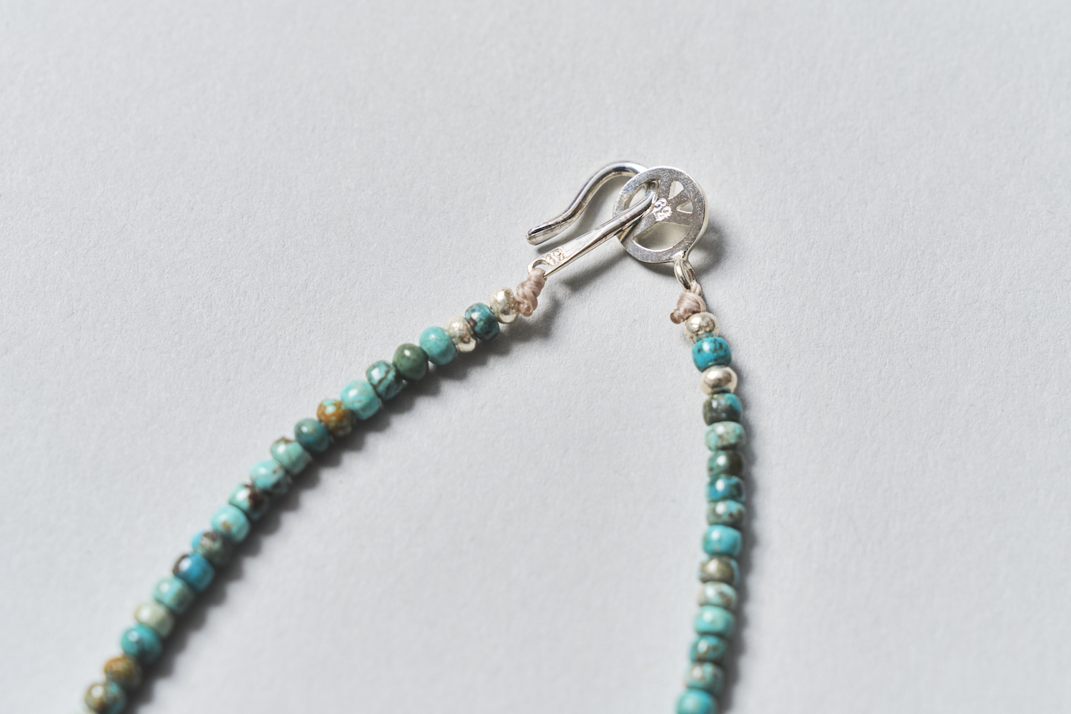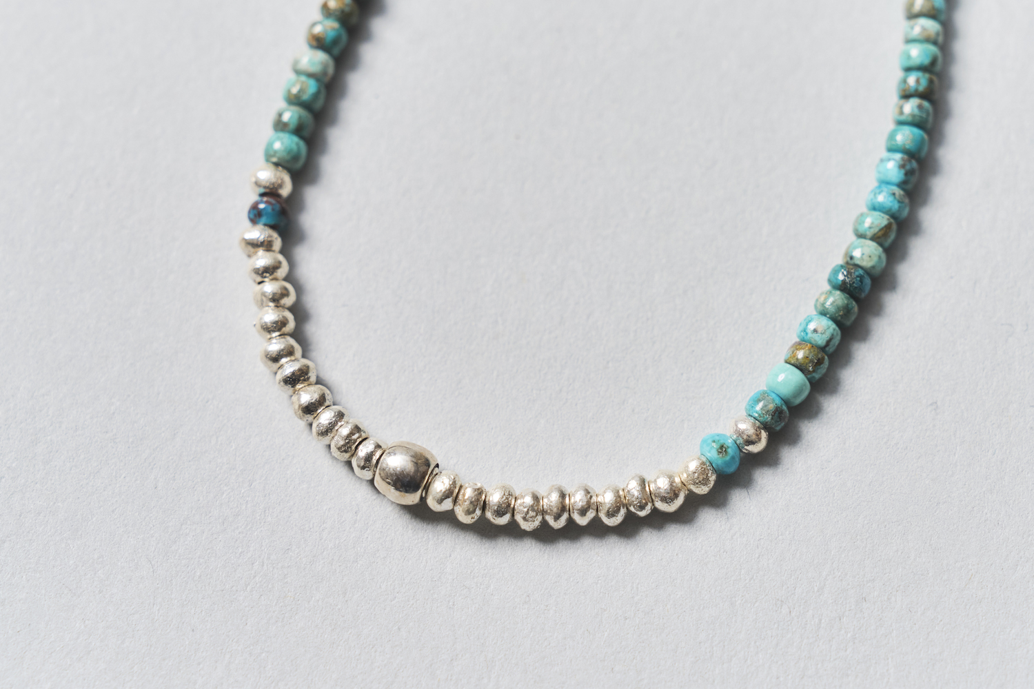 天然石ターコイズの深い色合いと、間に挟んだハンドメイドシルバービーズの絶妙なバランス。自然が生んだ模様や色味の違いがひとつひとつに個性を生み出す。