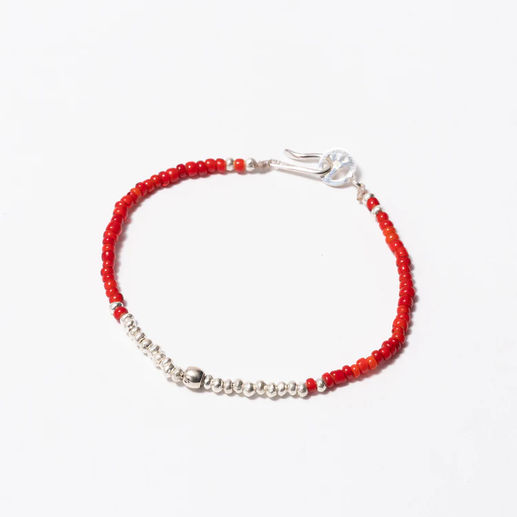 真っ赤なアンティークビーズを使った同デザインのブレスレットも展開中。