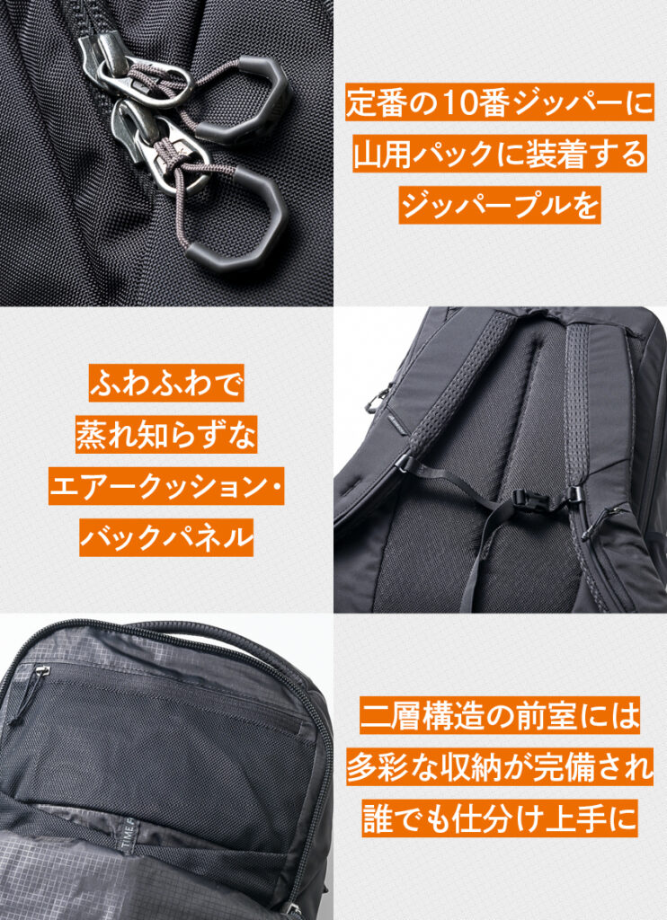 「“重い荷物を快適に運べるパック”は十八番。ミニマル顔だからスーツでも違和感なく背負えますし、メイン室にはクッション入りのPCスリーブも設けていたりと、ビズに役立つ収納も過不足なく盛り込んでいます」。