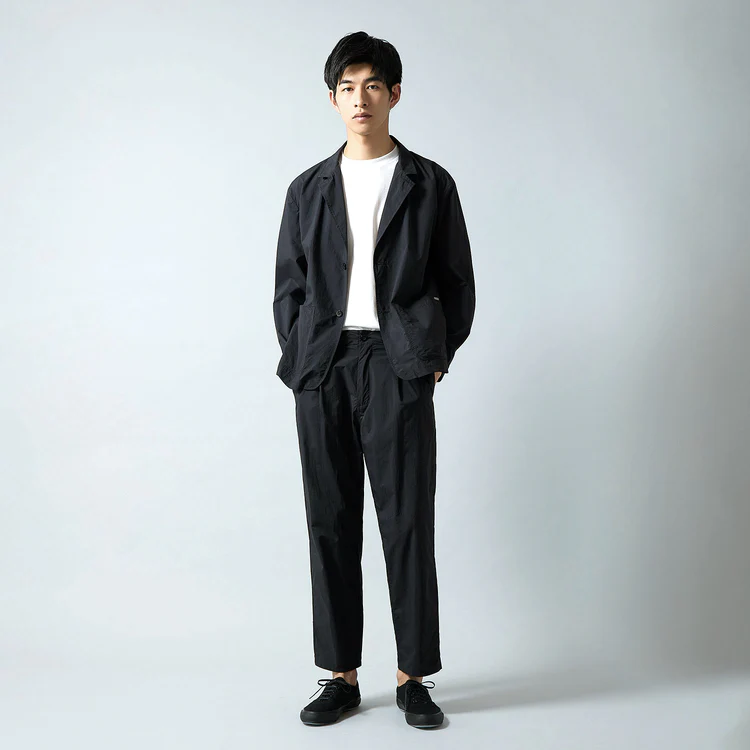 どこでもサラッと羽織れてキレイに見えるワークジャケットとパンツ。ジャケットは、ワークジャケットをベースに胸ポケを外してスッキリした印象に。襟元にボタンが付いていて留めるとブルゾンのようにも使えるのがポイント。パンツは、ワンタック入りで腰回りゆったり。裾に向かってテーパードするスッキリシルエット。素材はどちらもシワになりにくいライトナイロン製。自宅での洗濯もできるので清潔感もキープできる。