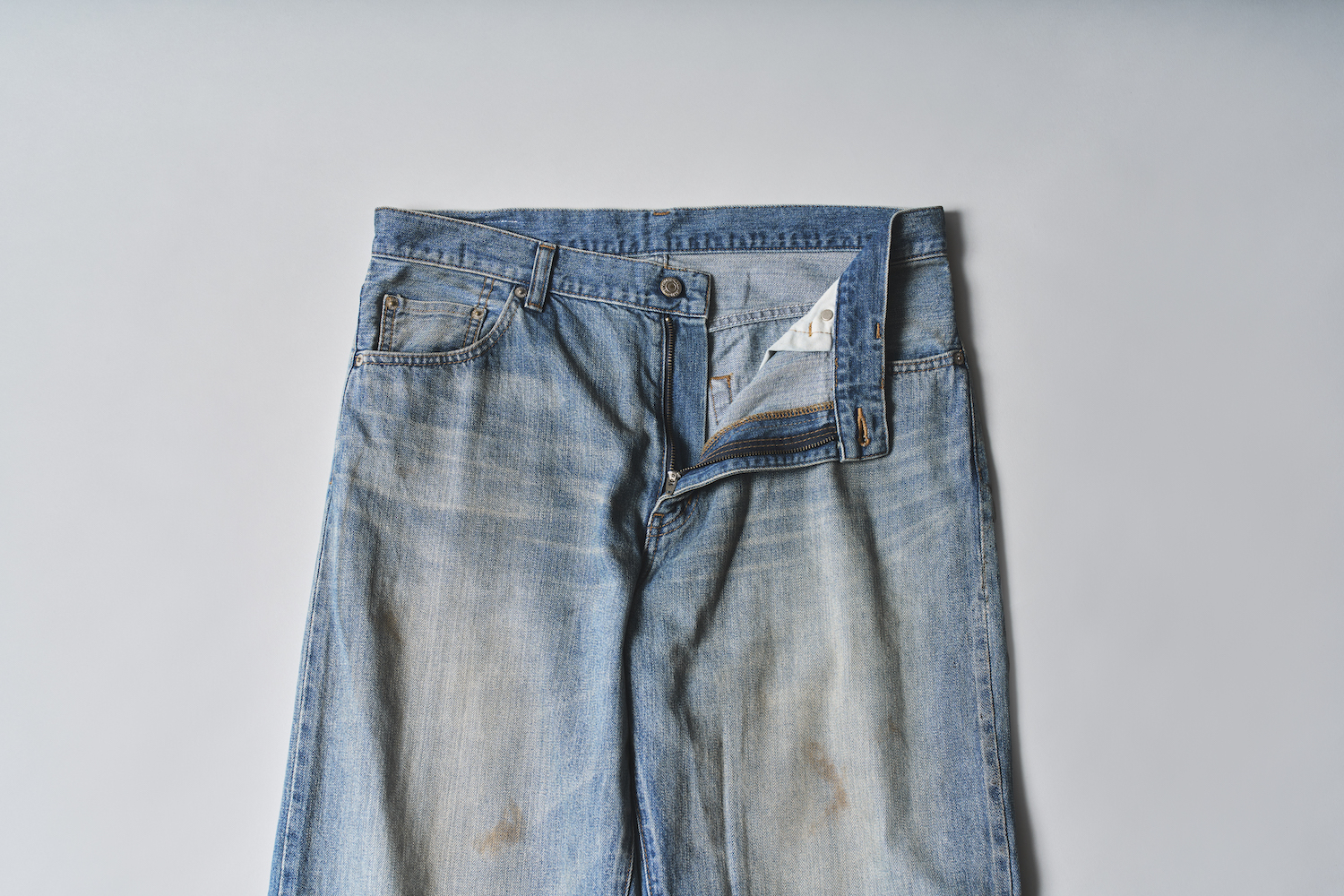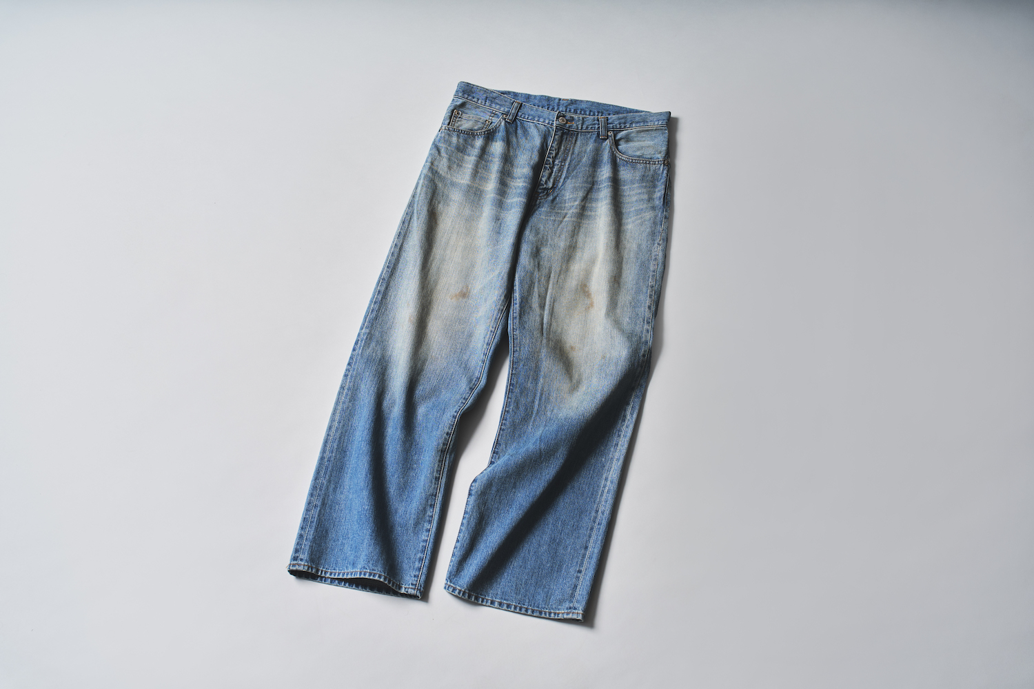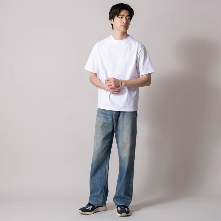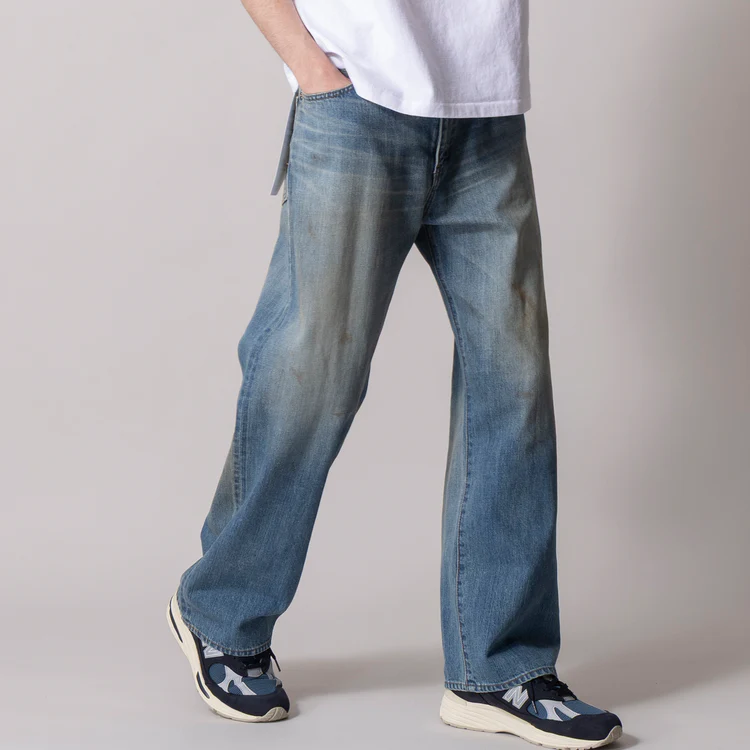 ヒゲ、シェービング、汚し、ダメージ加工を施し、ヴィンテージデニムの雰囲気を細部まで再現。メリハリの効いた加工感で、古着のような味わいを新品のうちから楽しめる。