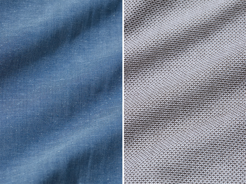 (左)スーパークールノンアイロンシャツ 綿麻/麻混紡のシャリ感が肌離れよく快適。 (右)スーパークールノンアイロンシャツ カラミ織/メッシュ状に生地に風が通るから涼しさ実感。